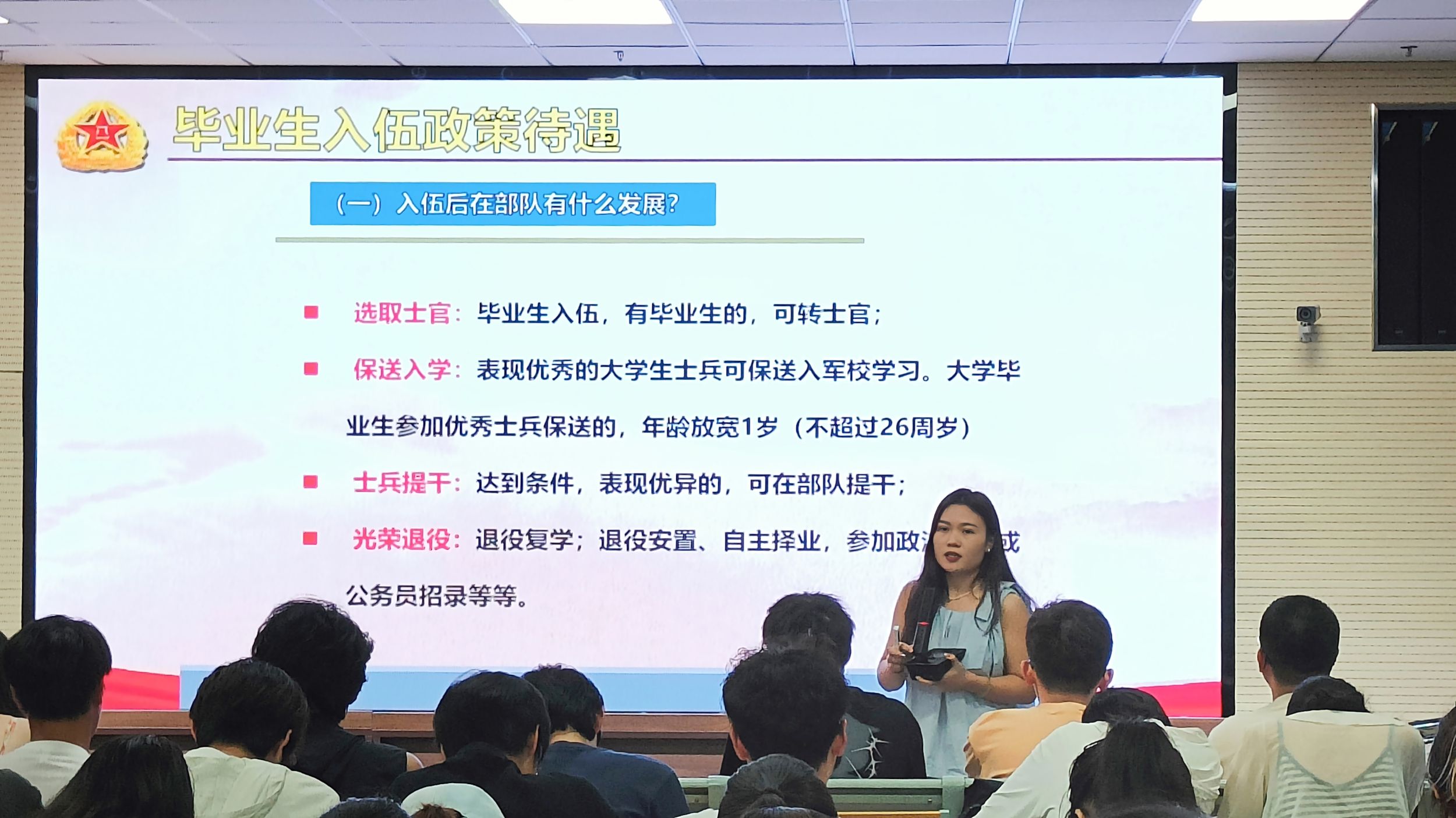 本次班会在唐老师亲切而富有激情的开场白中拉开帷幕,她首先强调了职业生涯规划的重要性,指出在新时代的背景下,同学们要尽早树立自我认知、目标导向和市场调研意识,了解不同行业的发展趋势、职业需求和就业前景,提前思考并规划未来。随后,唐老师从考研、考公、考编、就业以及应征入伍五个角度为同学们提供了未来可供选择的方向,并结合当前就业形势、历届毕业生就业去向以及自身成长经历等,建议同学们要结合自己的兴趣、专业、行业前景等多方面因素,聚焦自己的职业目标,制定行动计划。为帮助同学们了解大学生应征入伍政策,唐老师从应征入伍的十大理由、政策待遇以及如何参军入伍等逐一阐述,娓娓道来,鼓励大家勇于拓宽视野、敢于挑战不可能,积极追梦。同学们听后深受启发,纷纷表示要重新审视自己的职业规划,积极参与社会实践和实习活动,不断积累经验和提升竞争力。