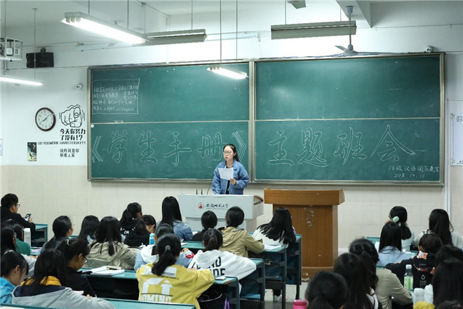 为进一步加强校规校纪教育,提升同学们的纪律观念和规则意识,10月14日,18汉教全体学生于固定教室2050202召开了学习《学生手册》主题班会。