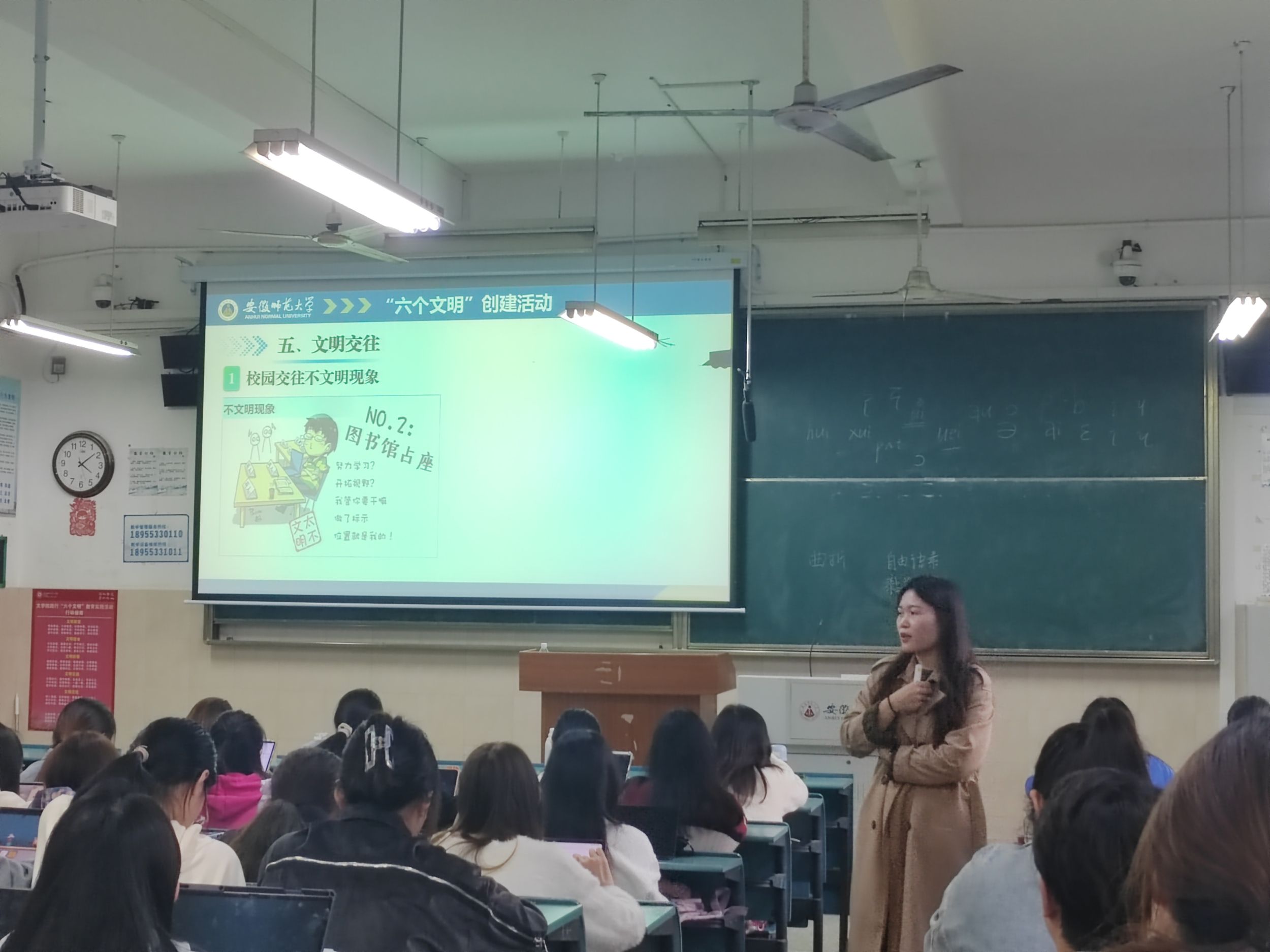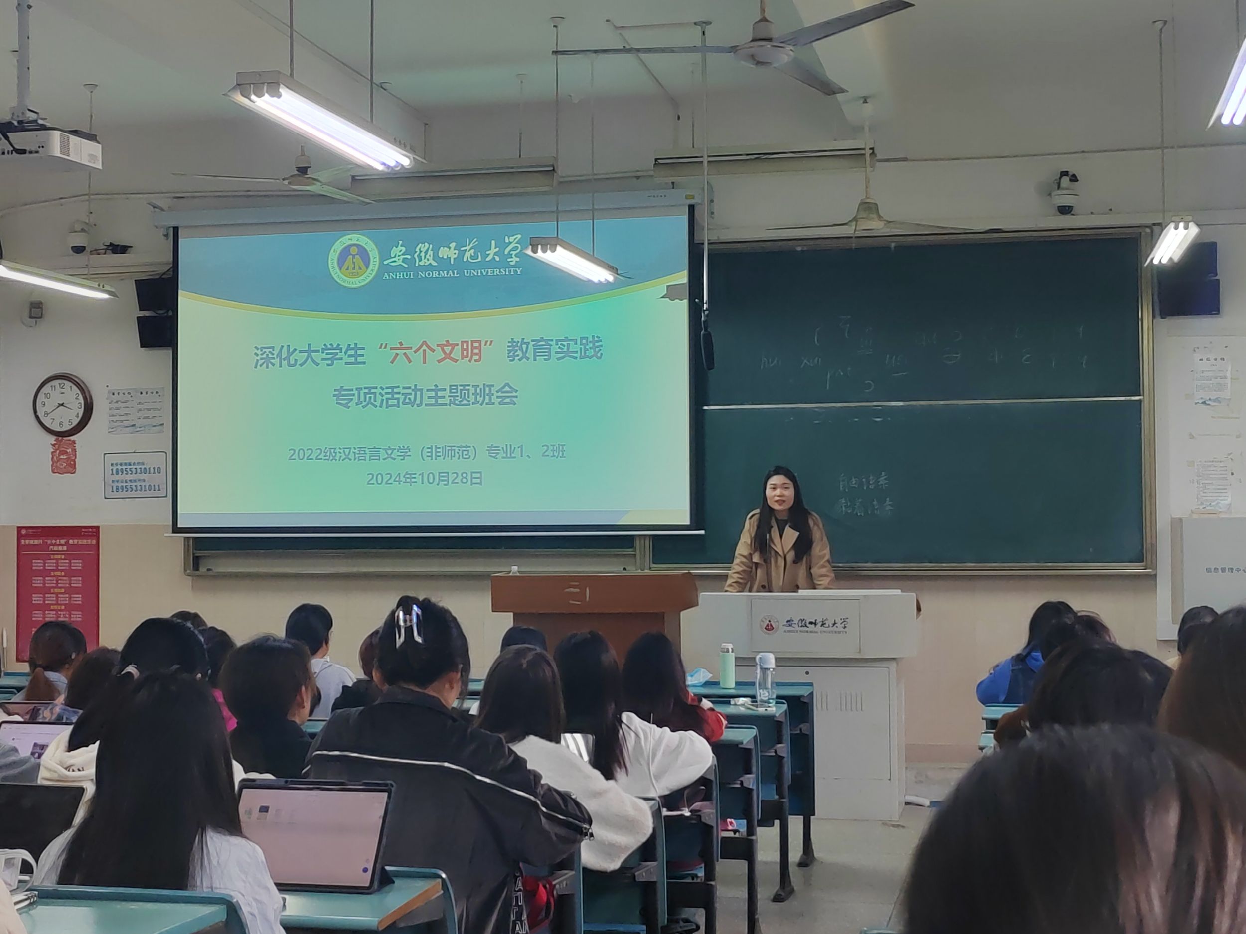 为学习贯彻习近平总书记考察安徽重要讲话精神,深入推进大学生护航行动计划,进一步规范学生文明行为,引导学生形成良好的行为习惯,10月28日下午,汉语言文学(非师范)专业1班、2班开展了深化大学生“六个文明”教育实践专项活动主题班会,本次班会由辅导员唐宇晴老师主持开展,全体同学参会。