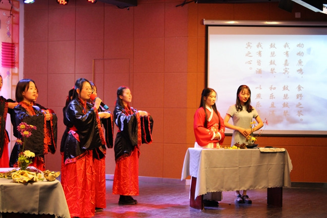 “呦呦鹿鸣,食野之苹。我有嘉宾,鼓瑟吹笙。”晚会开场由德雅书苑带来的《鹿鸣》以古人烹茶添香、择花诵读的雅事,为观众们带来千古前的传统风韵。由2018级汉非专业同学带来的《礼仪之邦》则展示千年以来炎黄子孙的风骨与美德。筝声鸣鸣,鼓声阵阵,红衣飞扬,舞姿动人,中华的古朴大气尽在美妙的表演中。而古风歌曲《是风动》与《忆红莲》却是别具一格,以现代方式展现古典之美。