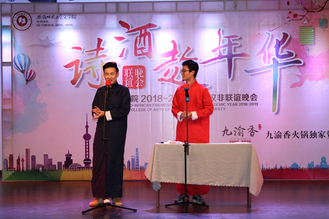 别具地方特色的东北快板和二人转让人眼前一亮。郭诚和吴帅同学带来的《文学趣谈》将文学与相声艺术相结合,可谓妙语连珠。小品《如懿后传》笑点频现,随着节目的推进,台下欢笑声起此彼伏,大家更是在欢声笑语中更加珍惜进入大学的学习机会。异彩纷呈,扣人心弦的表演将现场气氛推向一个又一个高潮。互动游戏“击鼓传花”中师生同台,台上台下积极互动。杨穆龙老师更是用歌声回忆青春 ,鼓励同学们热爱青春,珍惜韶华。希望大家把自己的梦想作为前进的方向和动力,应在美好而短暂的时光里不断奋勇前。