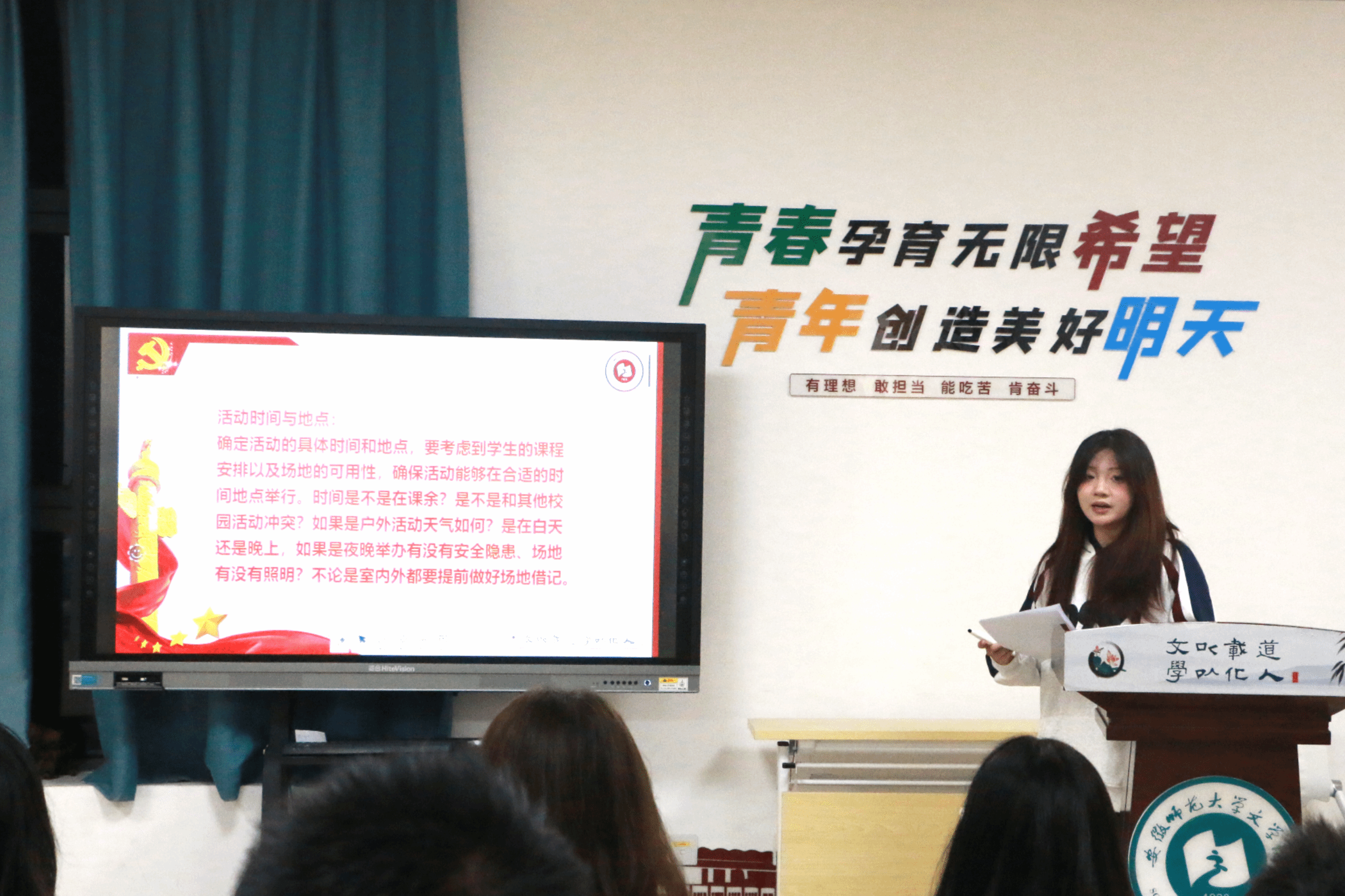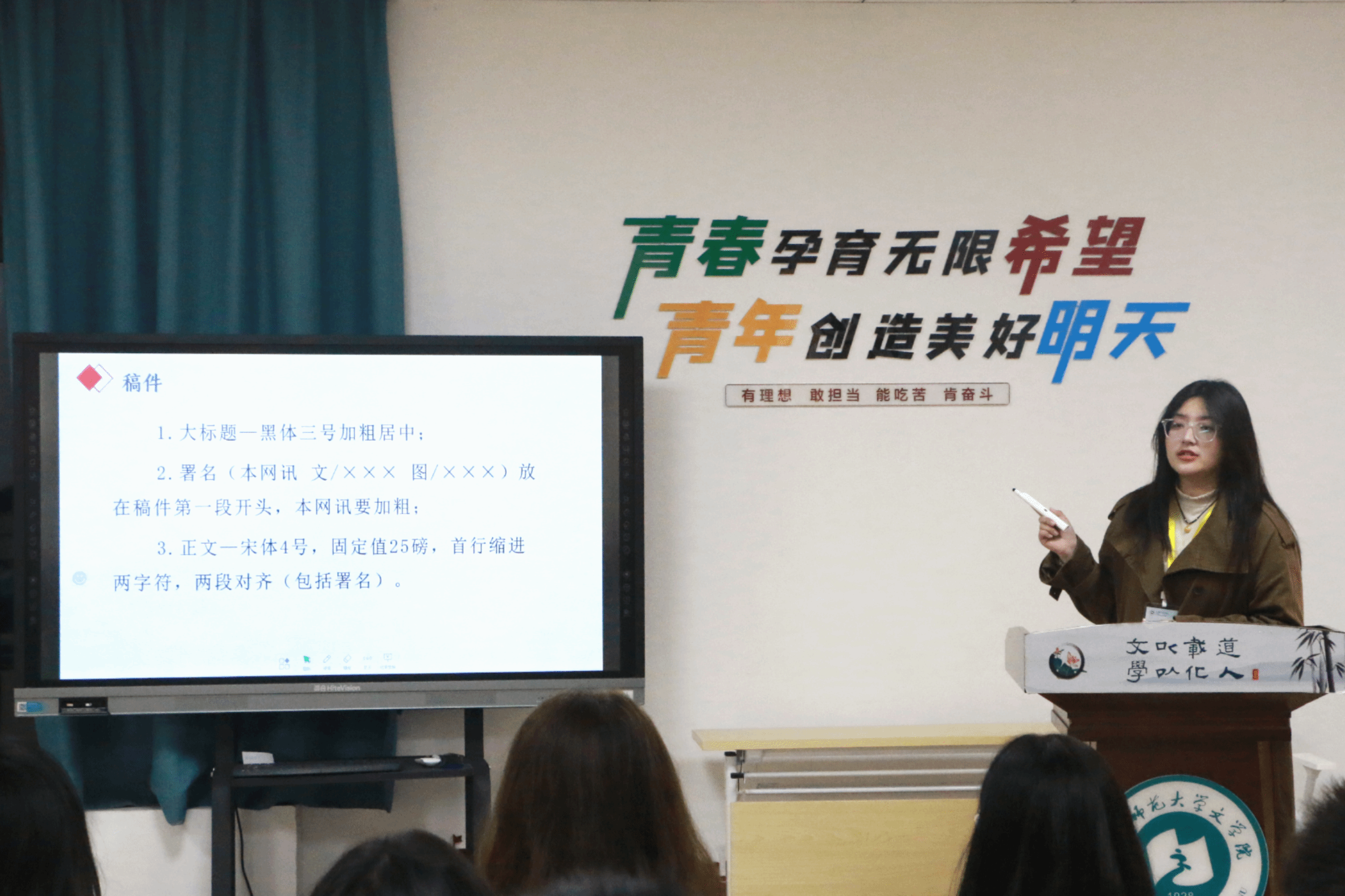 首先发言的是团委新闻部的负责人杨乐凡。在新闻照拍摄上,她详细讲解构图、光线运用和抓拍技巧;在新闻稿撰写中,她介绍新闻稿的主要内容和撰写格式,针对相应的新闻稿件进行具体剖析,助力学生组织更好地宣传活动。随后,学生会生活权益部负责人靳晓凡带来活动策划案撰写培训。她从活动开展背景、目的意义、目标多个维度展开,深入剖析每个环节的关键要点和注意事项,帮助同学们掌握策划一场精彩活动的精髓。最后,学生会综合部负责人孙跃进行会务和通知培训。孙跃详细讲解了会务合作所需遵守的会议礼仪,每一个环节都清晰明了;在通知撰写方面,她强调信息准确、语言简洁和格式规范的重要性,结合实际案例让同学们更易理解,为日后组织会议和发布通知提供有力指导。