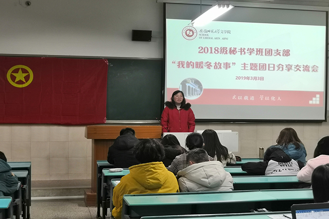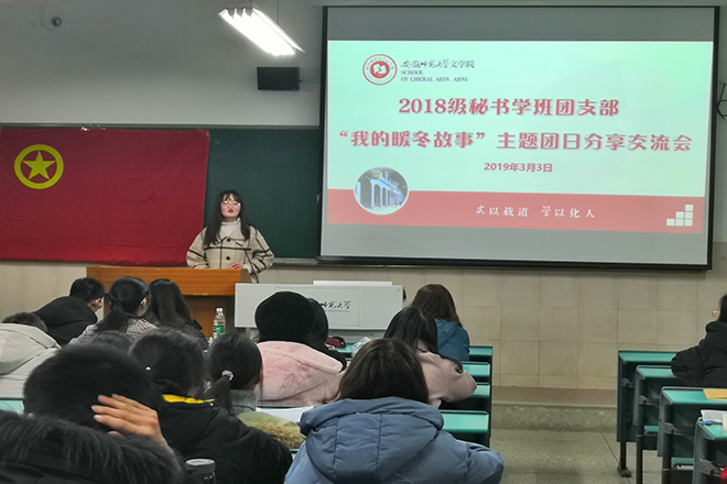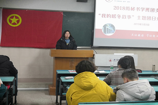 为深入贯彻学习党的十九大精神,坚定理想信念、牢固宗旨观念,提高党性、团性觉悟和修养,3月3日晚上19:00,2018级秘书学班“我的暖冬故事”主题团日分享交流会于行知楼2050501教室举行。本次活动由团支部书记王天宝主持,2018级秘书学全体同学参加。