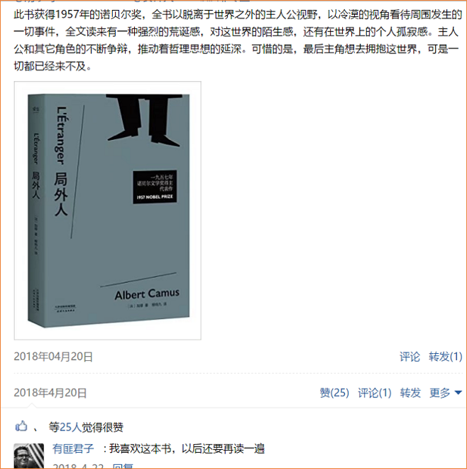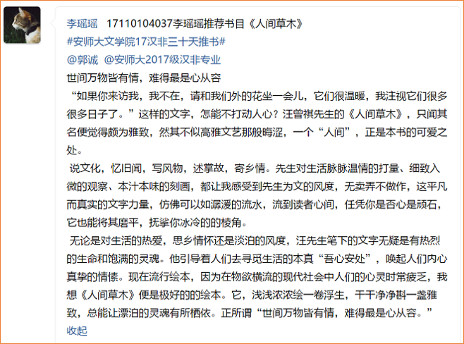 本次活动由一位同学推荐自己喜欢或者最近阅读的一本书,写一段书评并艾特下一位同学和官Q,官Q将在第二天进行转发,被艾特的同学持续接力。汉非1班的班长郭诚告诉我们:“线上分享读物方式简洁有效,参与广泛。阅读对我们专业的同学来说是非常必要的,如何选择书籍对很多同学来说也是一个问题,对大家来说任何书单都不如自己身边的师友亲自推荐可信。希望同学们能以此次活动为契机,养成广泛读书的好习惯。”