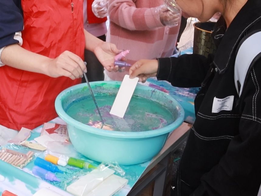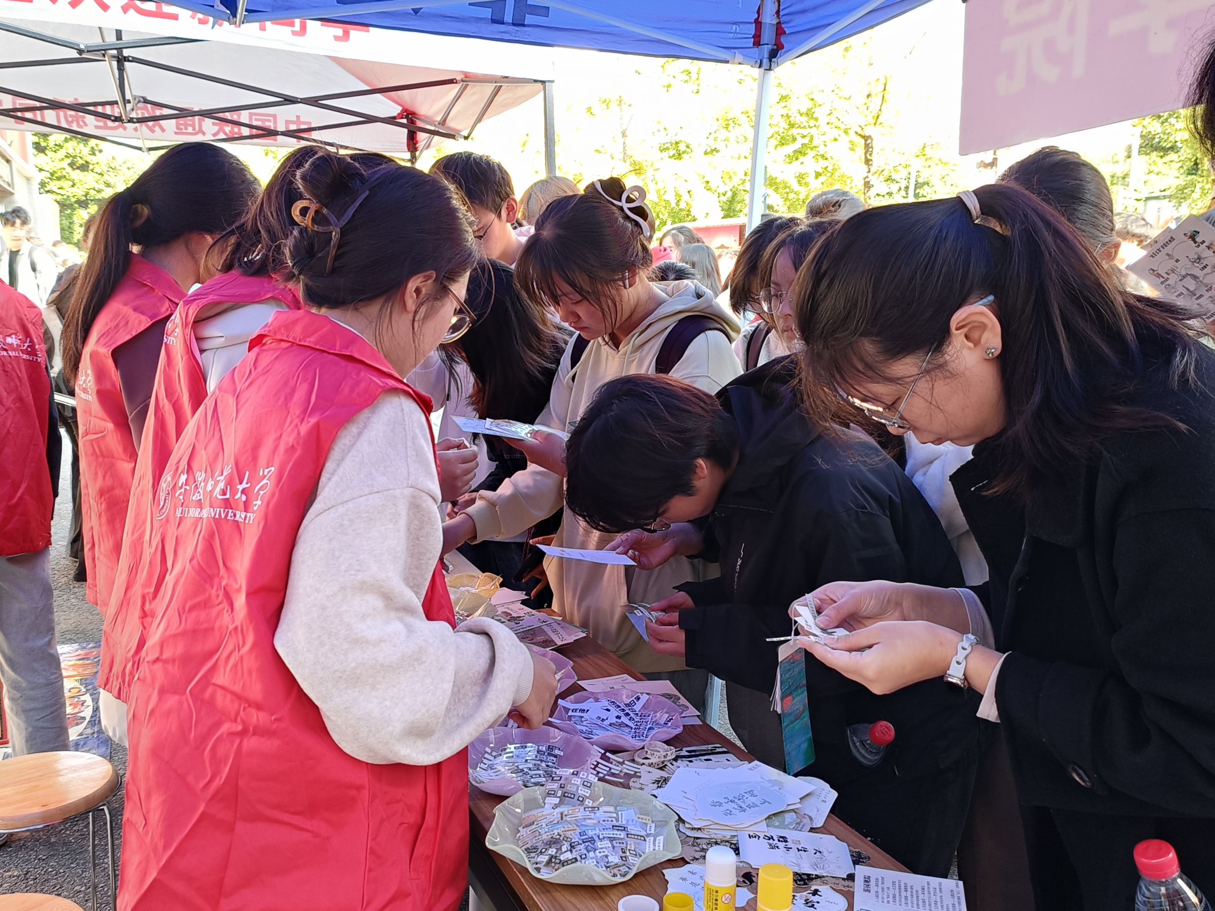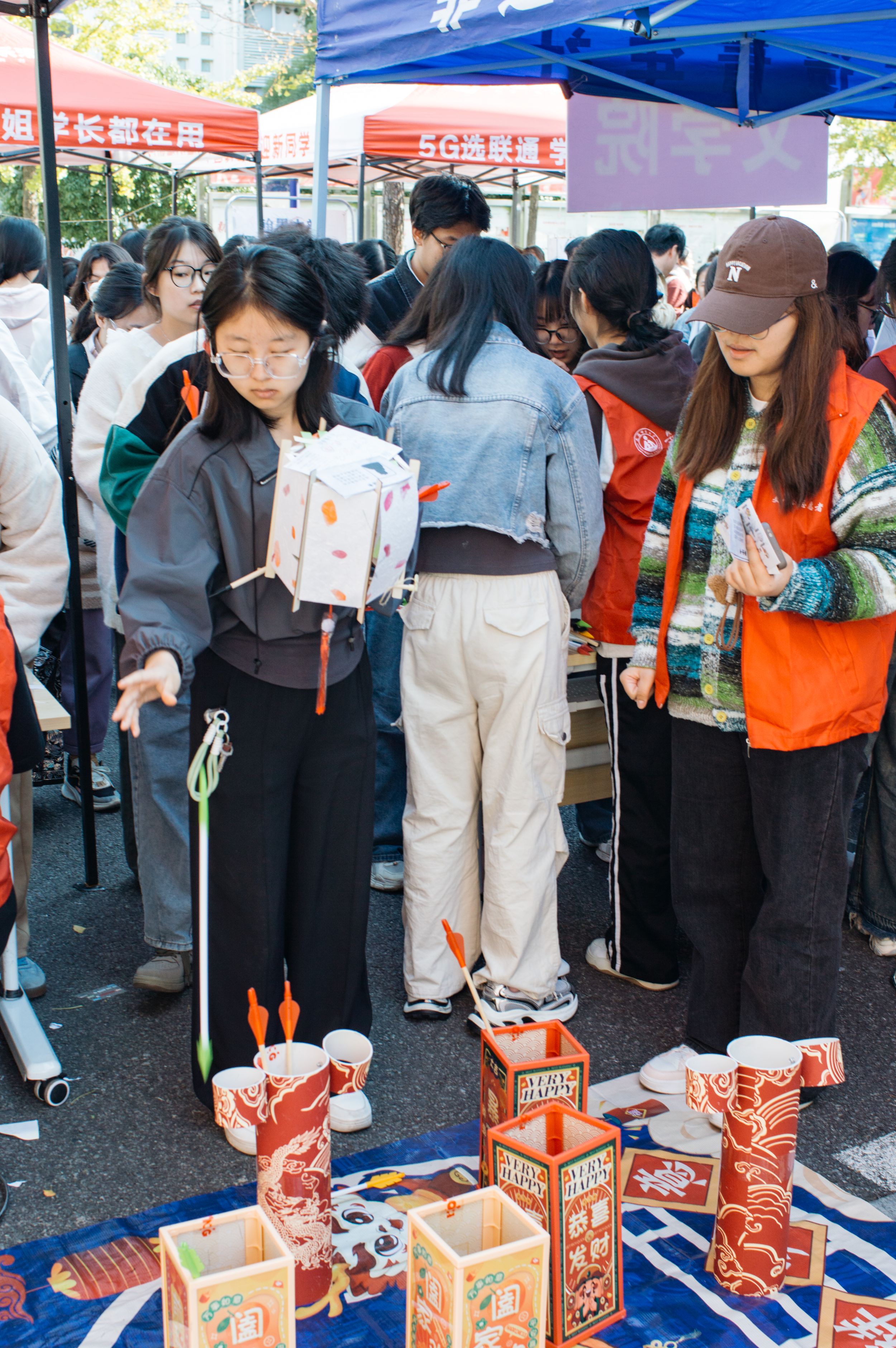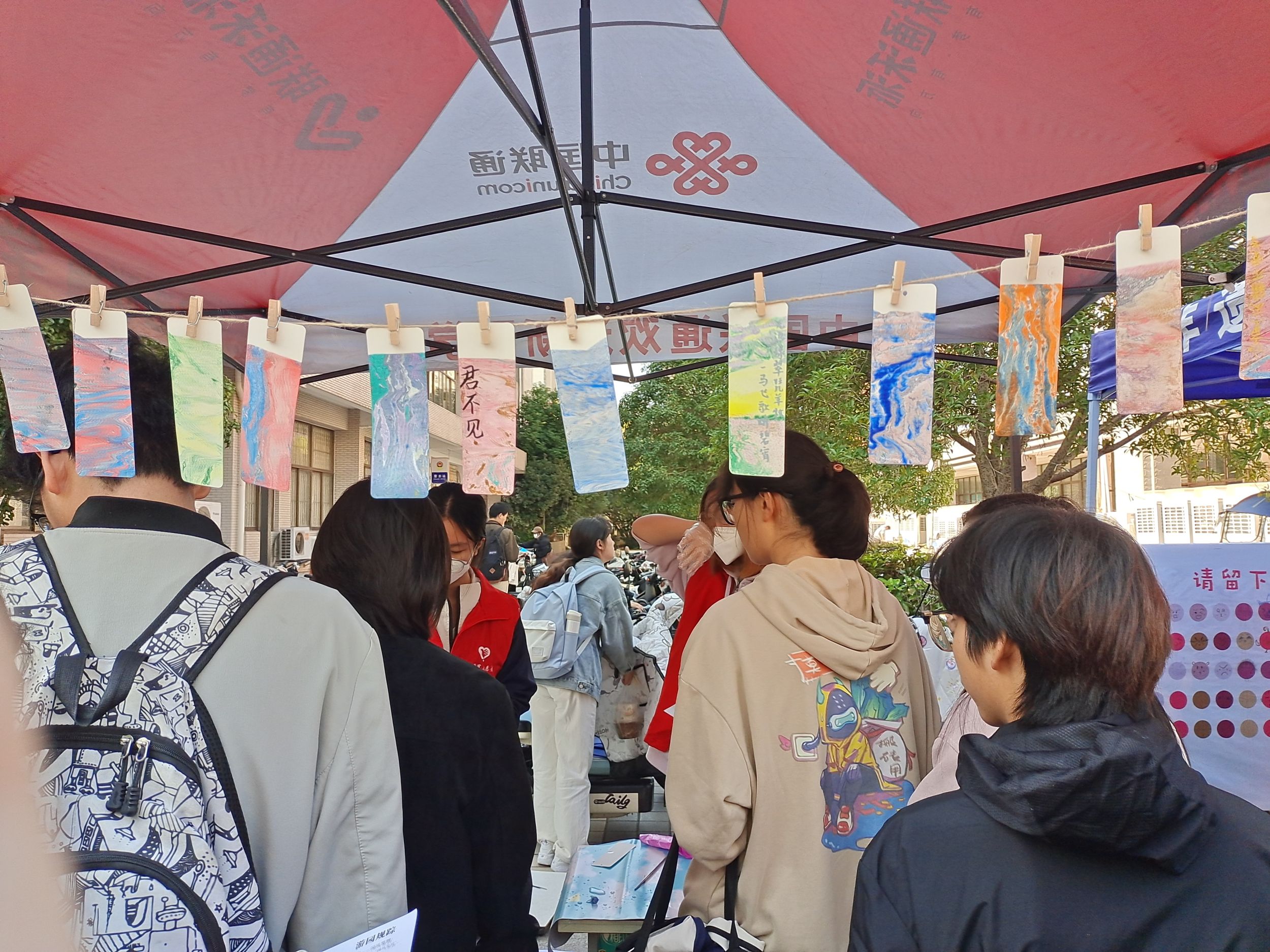 天气转凉,校园里一地金黄。制作落叶书签的展区温馨满满,同学们将精心挑选的落叶,书写上优美诗句并塑封,一枚枚落叶书签就像一首首凝固的诗歌,带着秋天的韵味,传递着诗歌文化;“诗词消消乐”游戏融合古典诗词与现代解谜元素,以其独特的玩法和深厚的文化底蕴吸引了无数同学。同学们以“诗词接龙”的模式,正确拼接出题目中完整的诗句。这不仅考验同学们的诗词知识,更锻炼了反应能力和逻辑思维;“筷意人生,热辣滚烫。”同学们从提供的诗句纸条中选择自己喜欢的句子,并将选定的诗句粘贴在卡纸上,自由组合成一首诗歌。通过将这些碎片化的文字绘制成色彩斑斓的画卷,创作出富有创意的诗歌;“暇日宾月集,投壶雅戏同。”同学们通过抽卡猜诗人,再手持箭,寻找合适的角度和力度进行投掷。游戏中,每个投壶的动作都是那么的优雅和刺激;制作漆扇活动现场,同学们热情高涨。在工作人员帮助下制作独一无二的漆画书签,随后用毛笔蘸取色彩绚丽的漆料,或书写经典诗句,或描绘诗歌中的优美意境。一笔一划间,是对诗歌文化的深情诠释,每一张书签,每一把漆扇都承载着浓厚的文化底蕴。