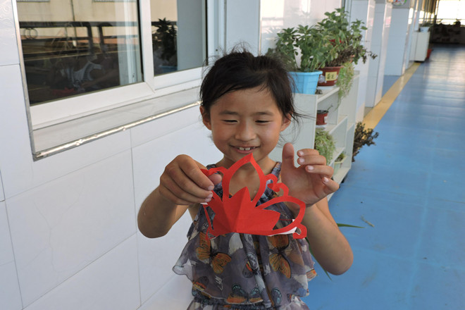 每天下午2:30,书法班,绘画剪纸班,舞蹈班等六大类别的兴趣班便如火如荼地开展。保证每一名学生都能够选到自己喜欢的课程,每一名学生都能够从中有所收获。“老师,这个我不会折”、“老师,这个我不会画”、“老师,我想剪苹果图案的”……剪纸课上,两名志愿者老师被孩子们团团围住,一个接一个地帮助他们克服剪纸过程中的重重困难。左一刀,右一刀,孩子们很快熟练地剪开了。“慢点剪,小心别伤到手”志愿者老师关切地叮嘱孩子们说。一堂课下来,桌子上,地面上,全都布满了碎纸屑,红色、白色,黄色,绿色……五彩斑斓,落英缤纷。“老师,你看,这是我剪的”小朋友们个个都充满喜悦地将剪成的作品托举到脸前展现给老师看。教室里高高挂起的电扇在慢悠悠地转动,空气依然温热,然而,孩子们的兴致始终丝毫未减。