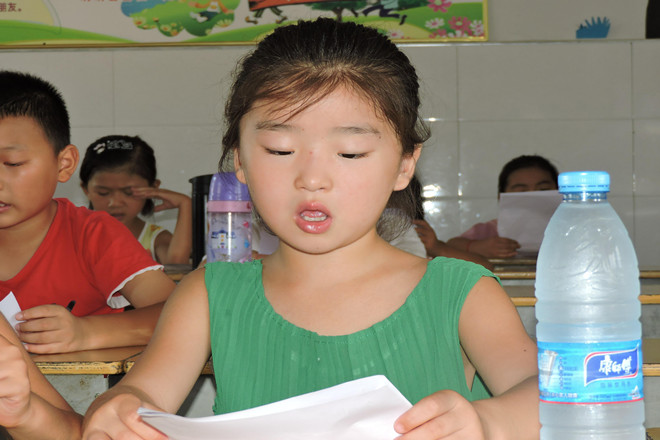 “江南可采莲,莲叶何田田……”借着清晨的第一米阳光,孩子们陆陆续续来到学校,整整齐齐地坐在教室里,手抚书卷,开始大声朗读起来!“老师,早上好!”志愿者一走进教室,耳边便传来孩子们清脆的问候声,顿时,身为一名教师的欣慰感油然而生。“今天,我们来诵读前十首古诗词,熟练朗读并争取会背。”志愿者老师以高标准严格要求孩子们。由于缺乏必要的普通话交流与练习,这些孩子的方言口音很严重,以致于误读了某些文字的读音。再者,孩子们知识水平存在差异,文学素养高低有别,一部分孩子会读的古诗文,另一部分孩子并不一定会读。基于此种情况,每天的晨读课首先由志愿者老师带读几遍,而后再让孩子们齐声朗读。长达30分钟的早读课,老师和学生,你一句我一句,在互动中进步,在书声中成长。