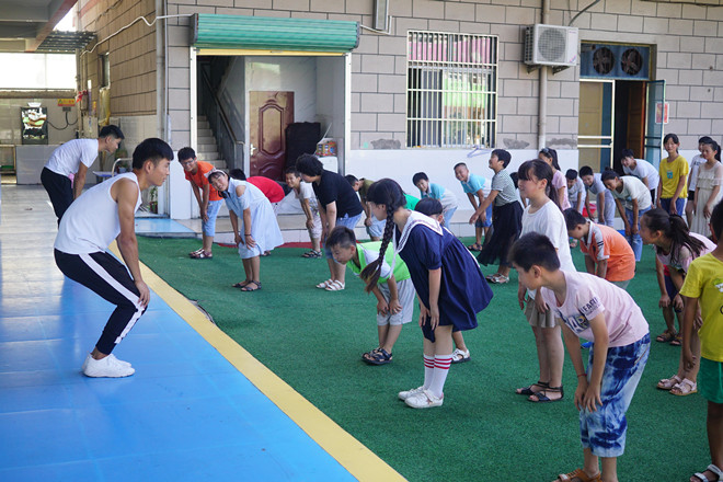 每天早上8:40分左右,面积不大的操场上便会准时出现几十名参差不齐的孩子们的身影。“每个年级按身高由低到高顺序排成两列站好。”体育老师在队伍前方声嘶力竭的喊着。被带到操场上的孩子们,犹如一只只被放飞天空的鸟儿,叽叽喳喳叫个不停。你拥我挤,你蹦我跳,你吵我闹,一阵阵天籁的笑声,一张张稚嫩的脸庞,交织成炎炎夏日最美妙的清凉。“两手侧平举,保证每个人都有足够宽阔的空间。”待小朋友秩序井然的排好队后,体育老师再次发出第二声号令。“跟我一起做”,一切都准备就绪以后,体育老师便开始了动作演示。“头部运动、弓步侧压腿……”这些人们习以为常的运动名称,锻炼动作,反而成为了孩子们的笑点。他们边笑边扭动着可爱的小身体。面对此情此景,团队成员都不由自主地满意地笑了。