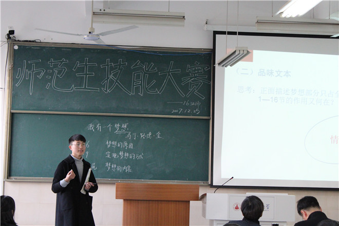2017年12月25日,2016级汉语言文学(师范)班级开展了师范生教学技能大赛的决赛。本次比赛从策划到举办历时近两个月,班委们精心组织、认真筹备,班级同学踊跃报名、积极参赛。经过第一轮的严格选拔,最终11位同学成功进入决赛。必赢线路检测3003no1写作教研室主任芮瑞老师、汉语言文学(师范)专业负责人项念东老师、16汉师辅导员赵瑜老师共同担任评委。本次师范生教学技能大赛的主要形式为无生上课。各选手按照抽签顺序上台授课,结束后接受老师的点评并进行答辩。