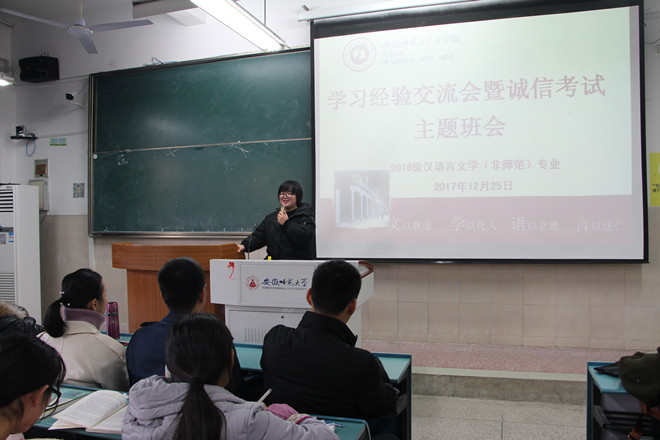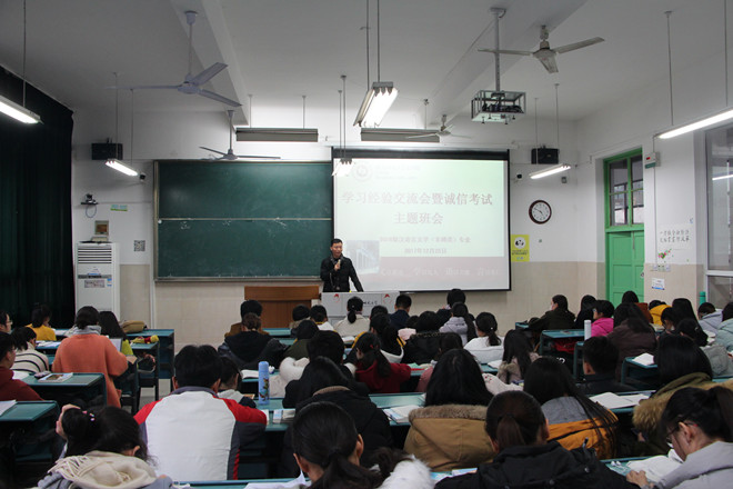 为帮助同学们更好复习迎考,增强诚信考试意识,同时引导同学们进一步完善学业规划,1225日下午,16级汉语言文学(非师范)专业于固定教室2050103举办学习经验交流会暨诚信考试主题班会。本次班会由辅导员周青松老师主持,14级汉语言文学(非师范)专业的何鑫学姐、祝福学长应邀进行经验分享,全班同学到场聆听。