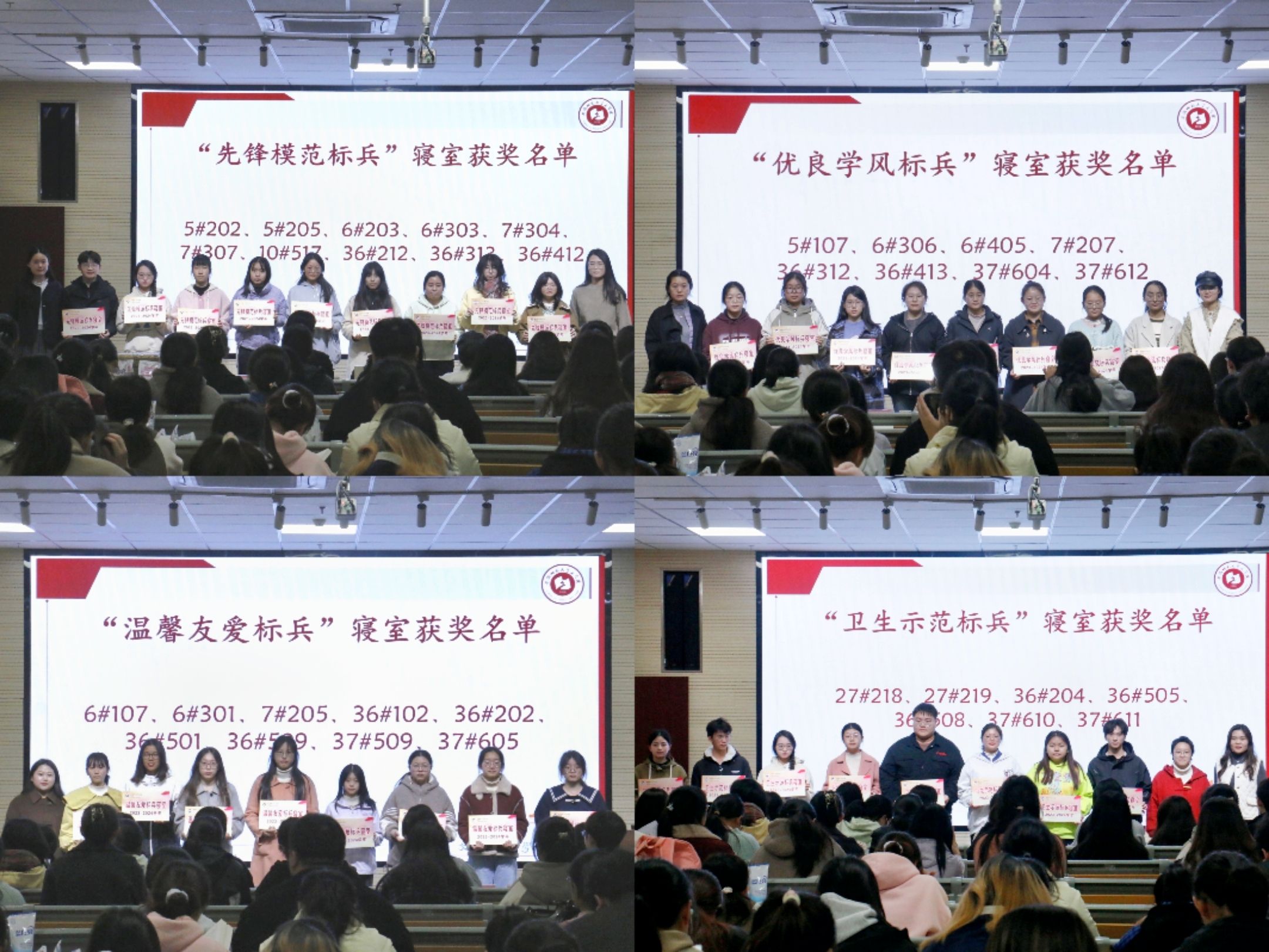 2023年秋季学期以来,学院启动为期一学年的文明寝室创建工作,本次大会旨在表彰创建工作中涌现出的一批优秀寝室和寝室长典型代表。会上,主持人宣读2023-2024学年文明寝室创建与评选大赛获奖寝室名单。天门山校区5#202等寝室获得“先锋模范标兵”称号;秋实园37#612等寝室获得“优良学风标兵”称号;天门山校区6#107等获得“温馨友爱标兵”称号;秋实园27#218等获得了“卫生示范标兵”称号。各寝室代表上台后,与会辅导员分批次为获奖寝室颁奖。