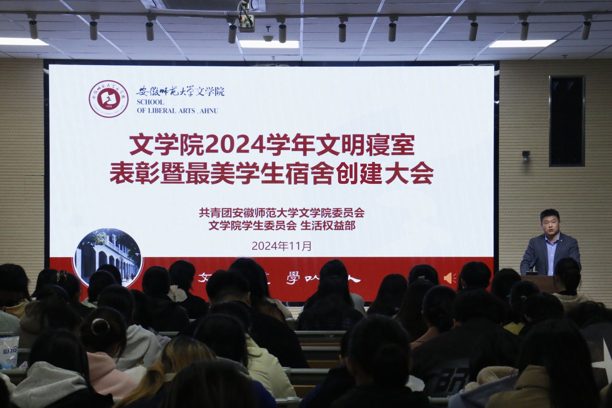 大会伊始,与会成员一起观看获奖寝室剪辑的风采视频。视频中的寝室展现了自己的独特风采,他们团结友爱、共同进步,整洁干净的寝室环境和浓厚的学习、生活气息让观众们连连称赞。