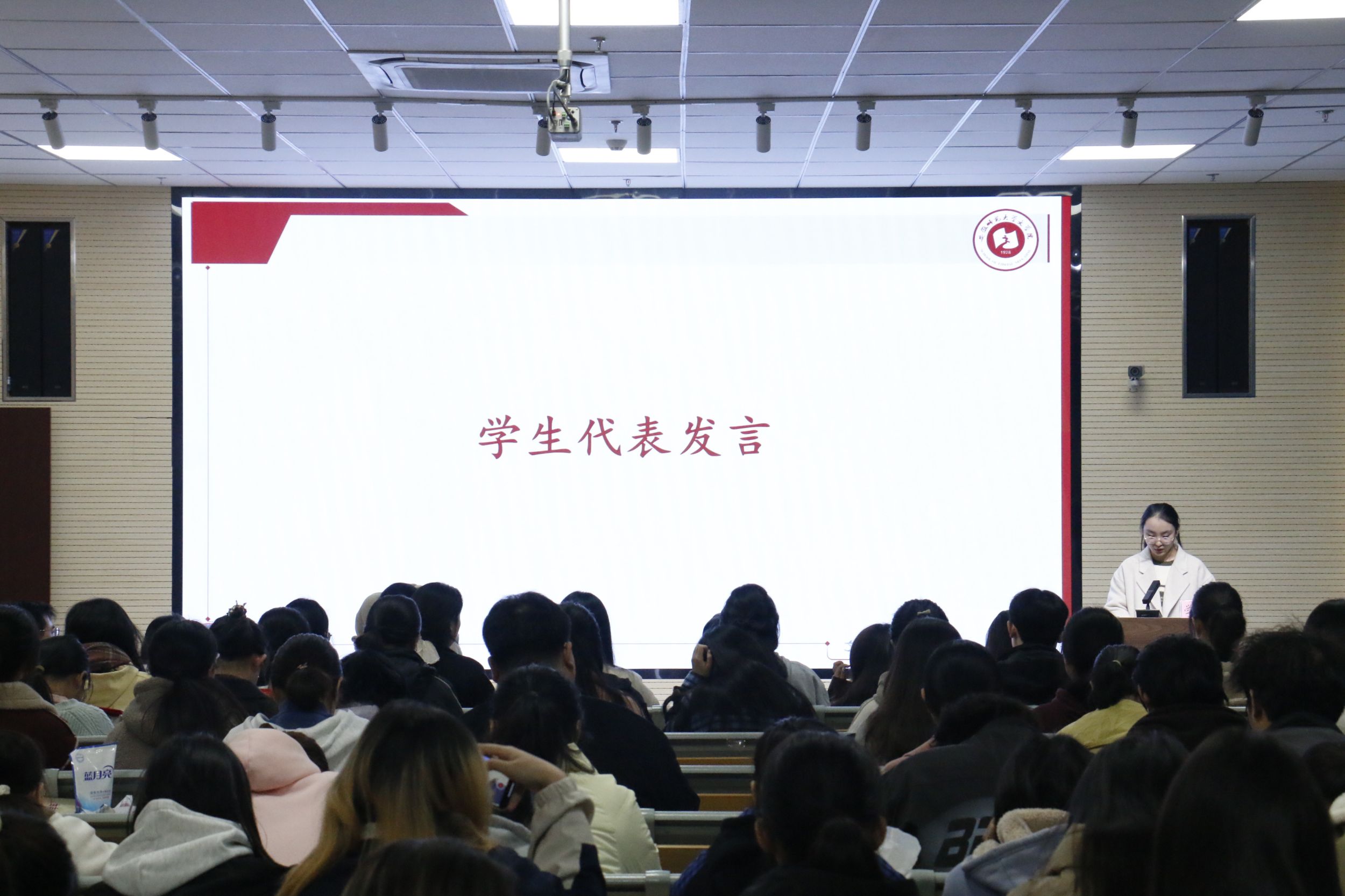 颁奖结束后,学院“最美寝室长”代表巴雨馨同学上台发言。她总结了一些文明寝室创建的心得,比如如何合理制定卫生值日表,共同养成良好的生活习惯,增进室友之间的感情等,这让在座的同学们体会到只要用心建设,为大家共同的“小家”努力付出,成为文明寝室并非难事。