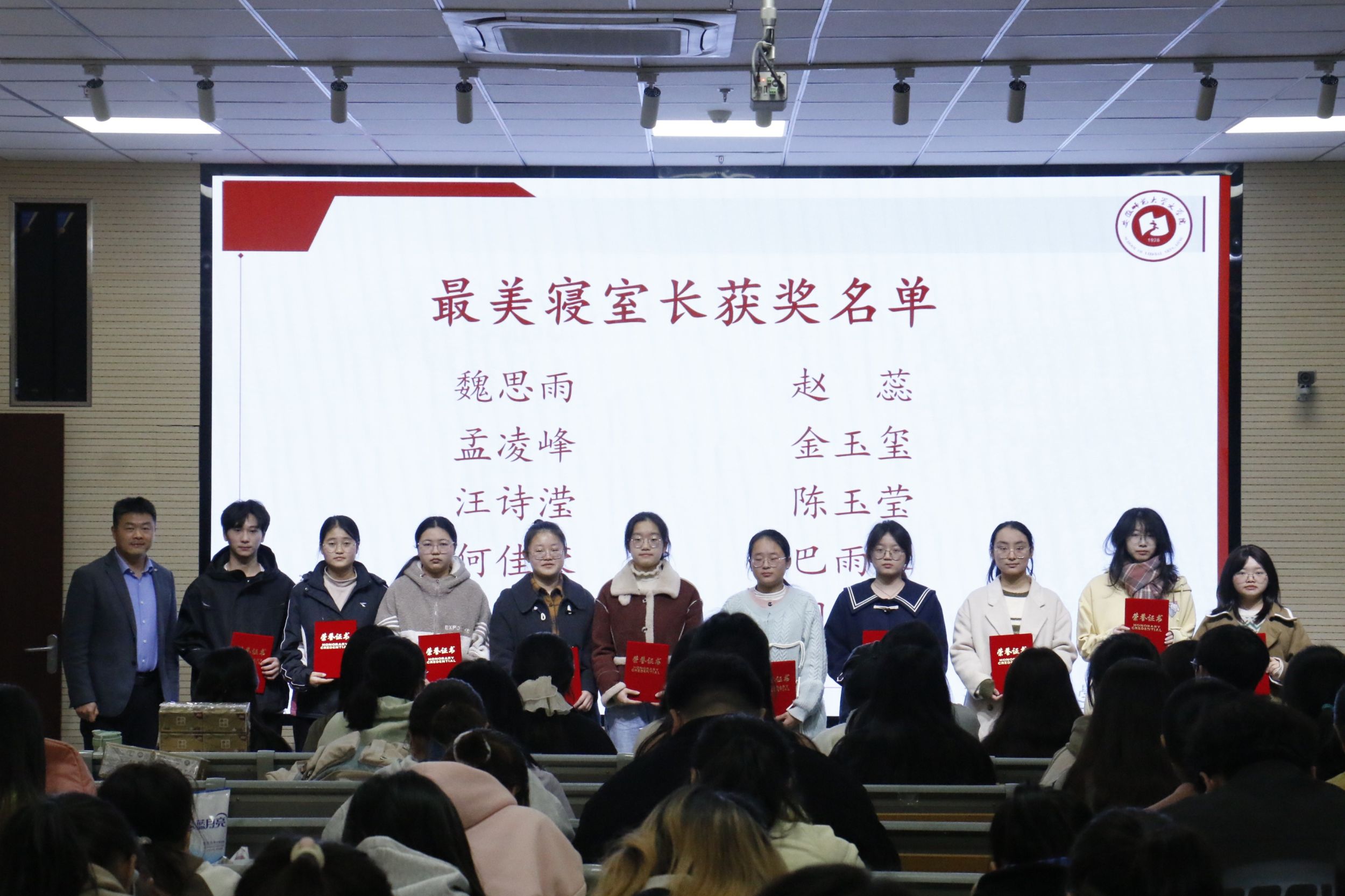 经学院评选,荣获2023-2024年度“最美寝室长”荣誉称号的学生是魏思雨、孟凌峰、汪诗滢、何佳蓉、李家琪、赵蕊、金玉玺、陈玉莹、巴雨馨、周静怡同学。刘飞为这些获奖同学颁发荣誉证书。