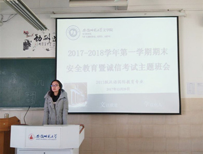 安全教育显温暖关怀,诚信考试展优良班风。临近期末考试,为了帮助同学们增强安全防范能力,树立诚信考试意识,12月20日上午,2015级汉语国际教育专业在教学楼2050405教室召开了“期末安全教育暨诚信考试”主题班会,班会由辅导员汪旭老师主持。