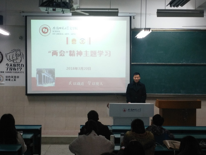 320日晚,2016级秘书学专业在行知楼2050202教室召开了学习“两会”精神主题班会,会议由辅导员周青松主持,16秘书学全体同学参加会议。