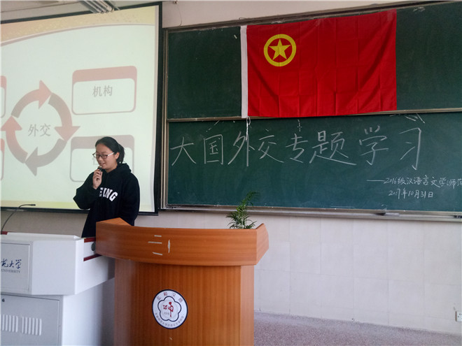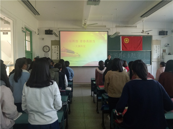 20171031日,在团支书沈笑同学的组织下,16汉师开展“大国外交”专题团学活动。当中国共产主义青年团团歌那熟悉的旋律响起时,同学们全体起立,齐唱团歌:“我们是五月的花海,用青春拥抱时代,我们是初升的太阳,用生命点燃未来……”激动人心的歌词和旋律,同学们感情充沛的歌唱,现场气氛十分热烈。接着,沈笑向大家简单介绍了外交的含义、性质、宗旨和机构。