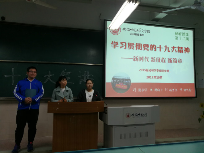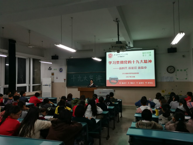 为深入学习党的十九大精神,10月31日晚上,2017级秘书专业开展了以学习贯彻党的十九大精神为主题的班会。本次班会由2015级秘书学专业王韵同学、方铭同学和匡晓江同学主讲,2017级秘书专业全体学生参加班会。