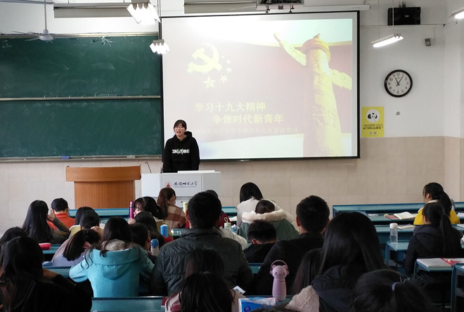 为学习宣传贯彻党的十九大精神,以十九大精神指引青年大学生更好成长,1124日上午,2016级汉语言文学(非师范)专业团支部于固定教室召开了以“学习十九大精神,争做时代新青年”为主题的学习教育活动。