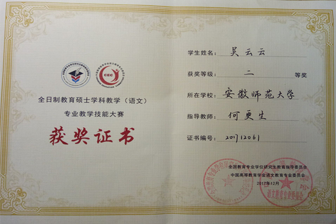 第二届全国全日制教育硕士研究生学科教学(语文)专业教学技能大赛2017年9月开始初赛,12月进行决赛,历时三个月。大赛由全国教育专业学位研究生教育指导委员会、中国高等教育学会语文教育专业委员会主办,北京师范大学、华东师范大学等84所院校的670名同学参加了复赛。经过组委会专家严格选拔,必赢线路检测3003no1语文课程与教学论专业2016级研究生吴云云进入决赛。12月7日,决赛于云南省玉溪师范学院隆重举行。比赛紧张激烈,必赢线路检测3003no1的吴云云在何更生教授的指导下发挥充分、表现突出,最终获得二等奖。(必赢线路检测3003no1)