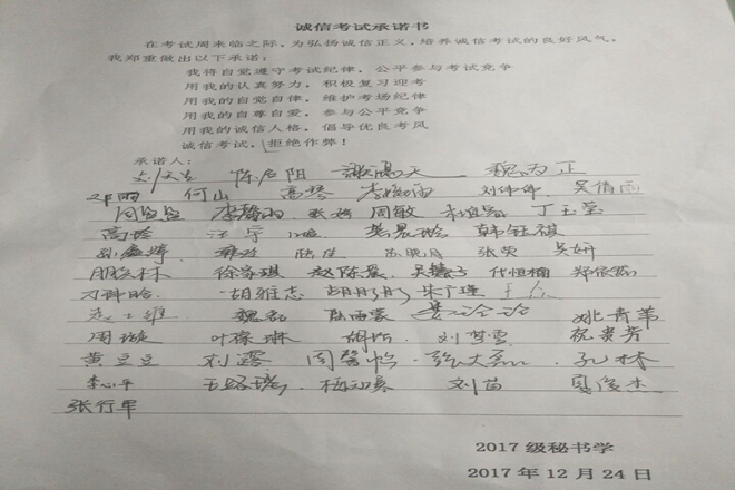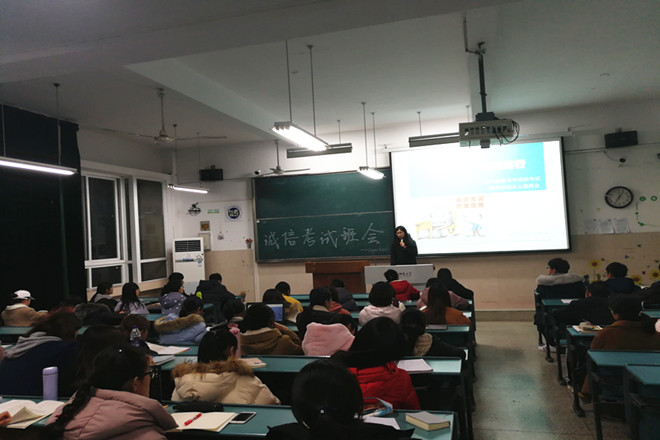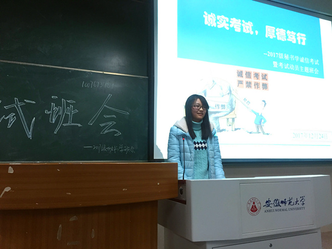 为形成诚实守信的考试作风,提高同学们对考试作弊严重性的认识,杜绝考试作弊现象的发生,为广大同学营造一个公平公正的考试环境,2017级秘书学专业于12月24日晚在教学楼2050301教室开展了以“诚信考试,厚德笃行”为主题的诚信考试暨考试动员大会。本次班会由辅导员徐雅萍老师主持,2016级秘书学专业李丽、项琴、康紫璇三位同学应邀进行分享交流,2017级秘书学专业全体学生参加。