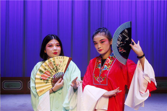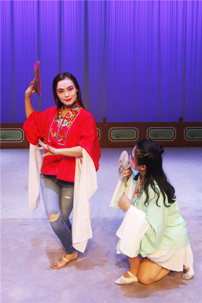 两位老师从最基础的台步、圆场教起,再从吐字、发音、曲谱、声调几方面,耐心细致教同学正音;继而分组教学,表演示范,分解动作,一步步引导大家走好台步,摆好身姿,甩好水袖,巧用纸扇,举手投足间,眼角眉梢处,呈现角色基态。每一个动作学起来都不容易。从花旦和小花旦的分开练习到两者进度一致、合作练习;从简单的甩水袖和拿扇子,最后能完整地唱演完一整段的《游园》;从小小的排练室到大剧场,反复确认角色及其道具的位置。每一天,实践团队的同学们都在认真地学习,因为一个不熟练的小动作反复练习,因为一句唱腔不准而反复研究。在剧场舞台上,同学们真正找到了归属,步履不停,即便下课了也仍旧不休息,都愿意多学一点,再学一点,因而,在最后的表演中,同学们都表现出了不俗的学习和适应能力。在这过程中,同学们也完成了从零到一的转变。