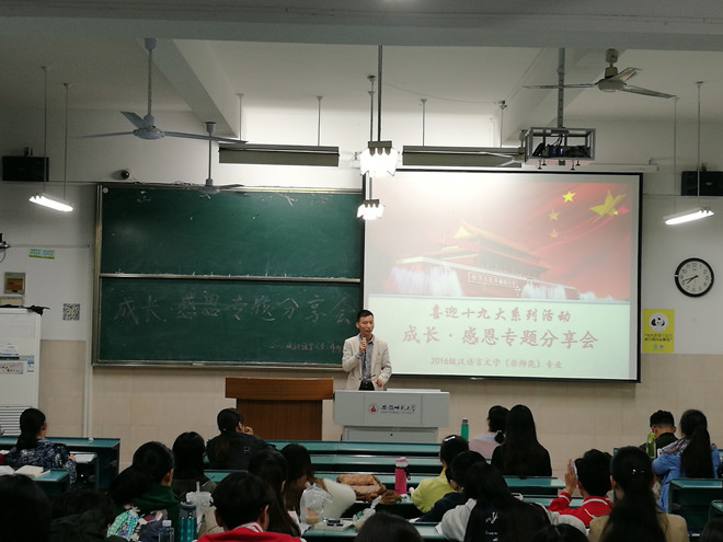为迎接党的十九大胜利召开,展现青年学子的良好精神面貌,1017日晚,2016级汉语言文学(非师范)专业于固定教室举办成长·感恩专题分享会。
