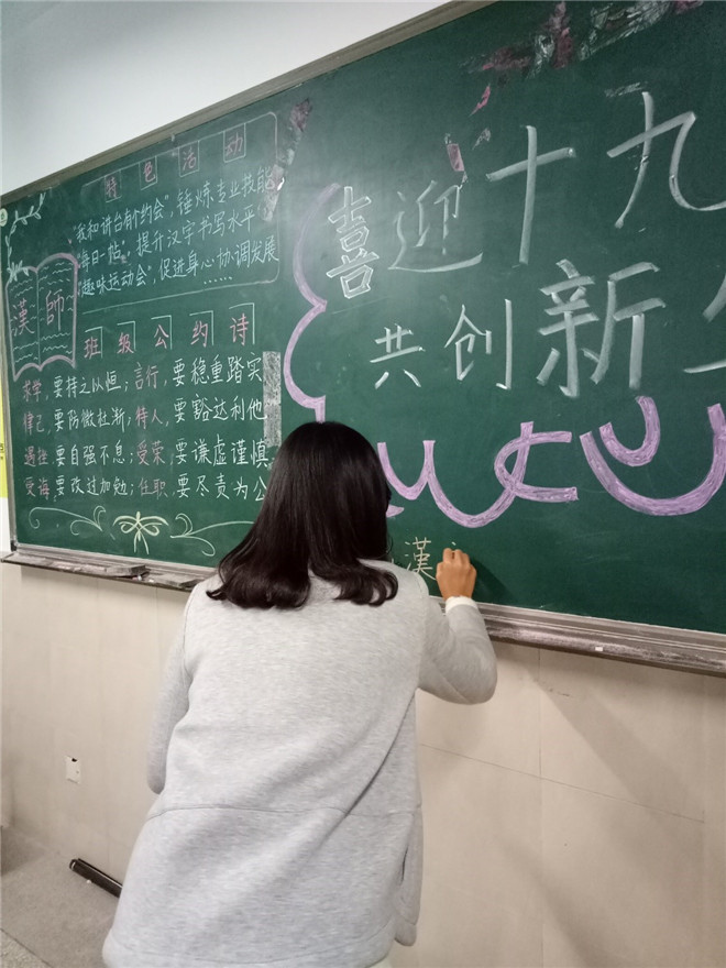 优美的环境能让人身心愉悦。汉师班级同学充分发挥才智,让教室环境既体现专业特色,又展现人情味道。同学们以“新学期·新生活”为主题并结合时政热点办班级板报。板报上,“班级公约诗”一目了然,时刻提醒每一位同学规范言行。班级同学一直坚持练字,此次班级布置中也将同学们的一些优秀书法作品张贴在班级外墙上,激励大家再接再厉。