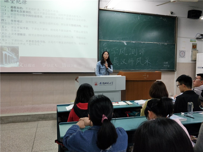 2017年10月19日,学习委员刘璐同学召开了“迎教学评估,展汉师风采”的主题班会。此次班会,让班级同学明确了“环境营造”和“课堂纪律”两方面的具体规定。例如,“食品不进教室、保持空气流通”和“规范课堂教学礼仪”等做法,既有利于班风建设,又对班级同学身心健康有所裨益。