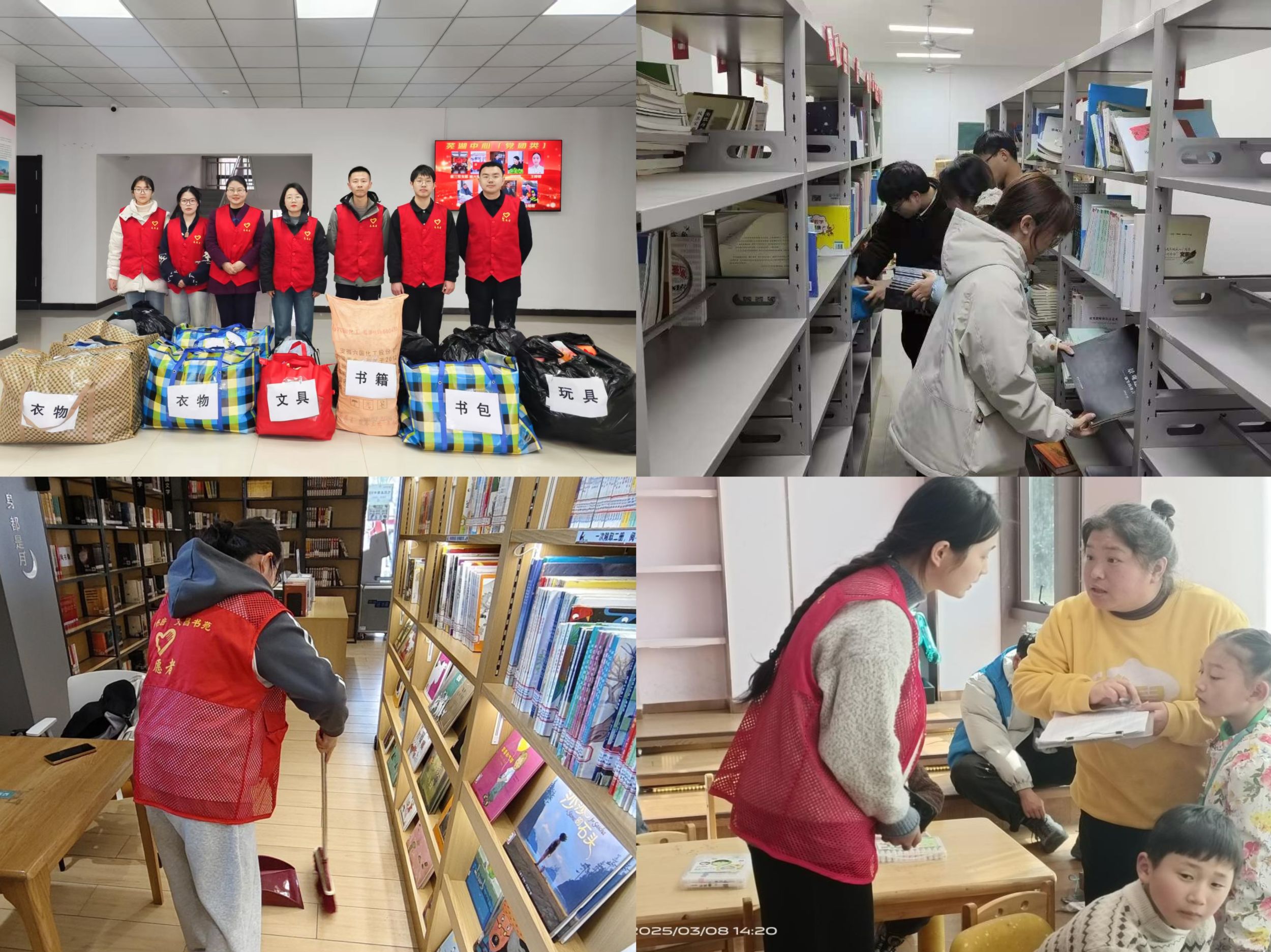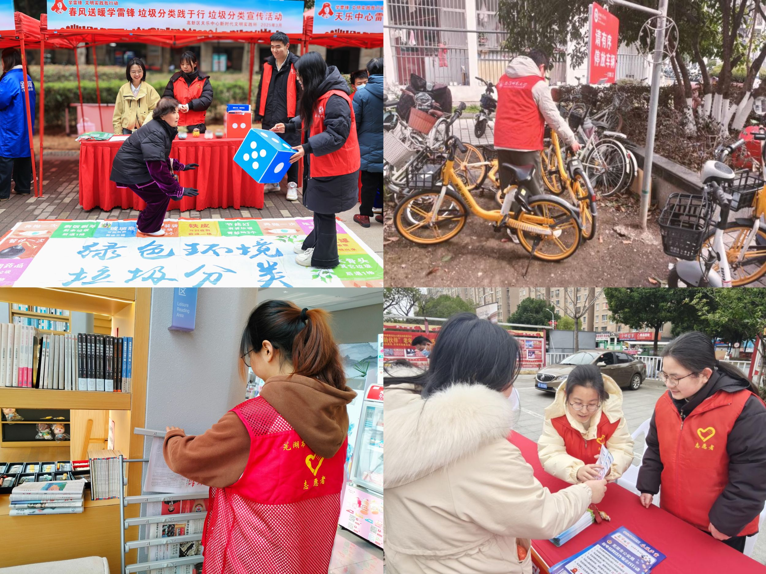 在本次活动中,汉语国际教育专业和汉语言文学(非师范)专业的同学们在各自实习岗位上开展了形式多样的志愿服务活动。汉非专业芜湖高速管理中心实习组以“青春实践学雷锋,校企共建献温暖”为主题积极组织开展“情暖山区·爱心传递”捐赠活动,向贫困山区儿童捐赠学习物资、生活用品和衣物被褥等,以实际行动传递爱心和温暖,发扬助人为乐精神。校出版社实习组以“书香浸润初心,奉献彰显担当”为主题开展了书籍清点整理及红色经典共读等活动,芜湖书房实习组在弋江区图书馆、马饮书房、马塘书院等公益场所积极参与书籍归位、秩序维护、答疑解问等志愿服务工作。市场星报社实习组成员积极融入当地街道开展“学雷锋”志愿服务活动,倡导垃圾分类“从娃娃抓起”,用现场讲解和互动游戏引导小朋友们参与垃圾分类,向居民发放精心制作的垃圾分类宣传折页,普及垃圾分类知识、加深居民理解、激发参与热情。大江资讯和国教院实习组成员细心捕捉到校园车辆乱停乱放和纸屑乱丢等不文明行为,便自发组织开展了“学雷锋·净环境·树新风”志愿清洁活动,同学们齐心协力,将散乱的车辆扶正,排放整齐,认真清理楼道里的垃圾纸屑,为营造整洁美观的校园环境贡献着自己的力量。