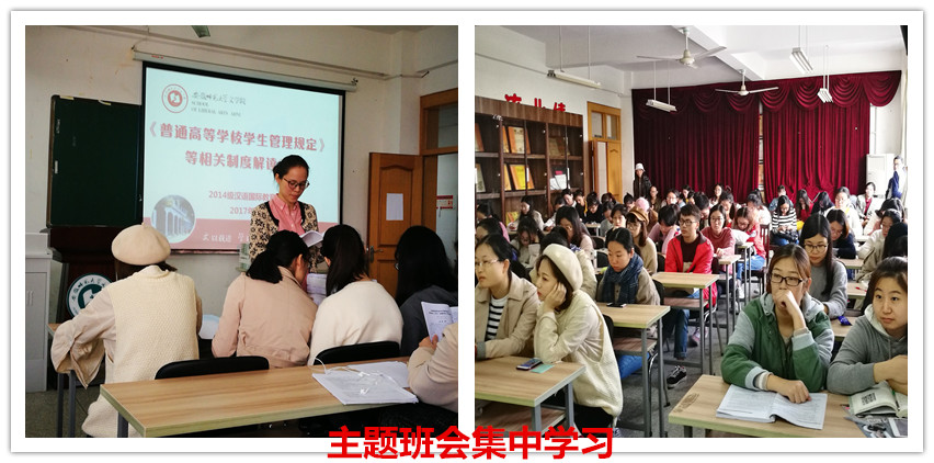 为了进一步加深同学们对文件的理解,10月22日上午,辅导员朱露露在必赢线路检测3003no1团委二楼会议室举办《普通高等学校学生管理规定》解读专题会议,必赢线路检测3003no12014级汉语国际教育、汉语言文学非师范、卓越班的200多名同学参加了此次会议。