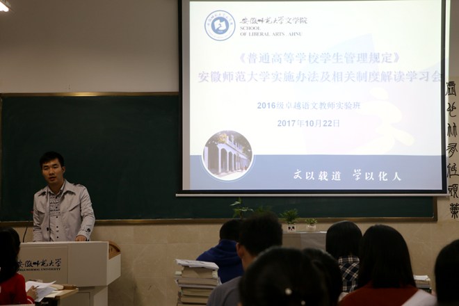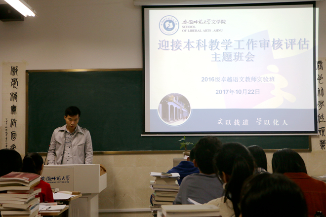 1022日晚,2016级卓越语文教师实验班在2010407A教室召开迎接本科教学工作审核评估主题班会暨《普通高等学校学生管理规定》必赢线路检测3003实施办法及相关制度学习会。班会由辅导员李震主持。