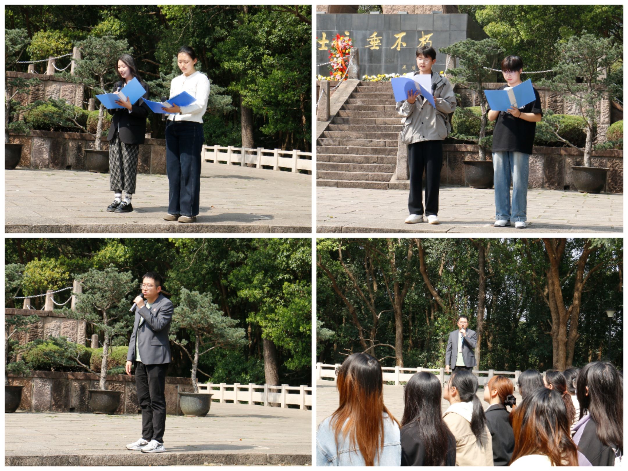 诗歌朗诵荡云霄,师者述史入人心。学生代表徐天翔、储凡越在碑前朗诵《纪念碑》诗选,声波顺着剑体状的石碑直冲云霄。在芜湖市烈士陵园讲解员吴鹏对纪念碑的讲解中,师生系统了解纪念碑建筑特色及其承载的精神价值,深入领悟革命碑刻的红色文化内容。活动尾声,全体人员齐诵主碑铭文,“他们的业绩和精神,已在后人心中铸起一座永不磨灭的丰碑……”声浪与风吹叶浪声融合,激荡在青年学子的心中。