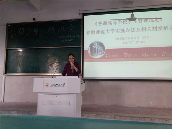 1023日下午,2016级汉语言文学(师范)班级召开主题班会,对于《普通高等学校学生管理办法》(教育部令 第41号)及学校相关制度文件进行深入学习和解读,并从学习、工作生活各个方面对每一位同学提出倡议和要求,积极迎接本科教学工作审核评估。