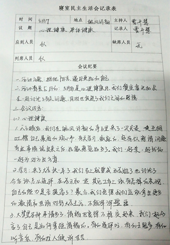 此外同学们还以寝室为单位开展了民主生活会,室友四人围坐一起,或谈自己最近的困惑、或谈自己成长的经历……室友间相互鼓励、相互排解,在谈心中拉近了彼此间的距离,对促进寝室和谐也具有重要作用。