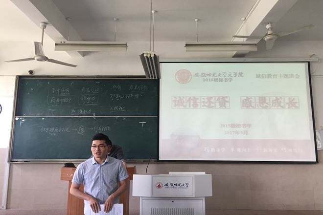 2015级秘书学召开主题班会,引导学生树立正确的价值观,提高学生对信用贷款、国家助学贷款等相关问题的认识,引导学生恪守诚信之德,践行感恩之心。同时,邀请校“自强之星”,13级汉语言文学国际教育专业的周惠,分享成长经历,交流生活、学习的经验,凝聚榜样力量,引导诚信航路。