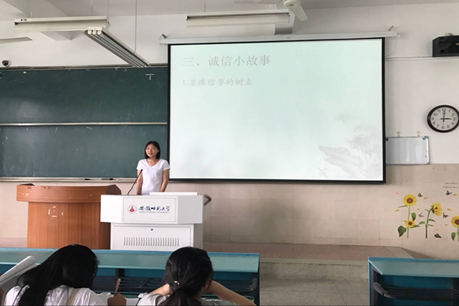 举行特色活动,结合专业实际情况,依托班级品牌活动——“秘轩开讲啦”,组织开展诚信专题课堂模拟,引导学生开展自我教育,让诚信案例走进课堂,此次活动共有十人进行讲授,班级内所有办理生源地助学贷款和受资助的全日制在校本科生均作为评委参与,讲授范围覆盖古代诚信美德故事、现代诚信主题诗歌、诚信主题教育散文,内容充实丰富;讲授方式包括主题宣讲、PPT课堂教学、班会模拟,形式新颖独特。授课的同学在收集资料、制作PPT、课堂讲授的同时加深了对诚信的理解,更加明白了恪守承诺的重要性;其余参与此次活动的同学也都对参与授课的同学进行点评,互相学习,促进共同进步,独立思考,牢记诚信誓言。