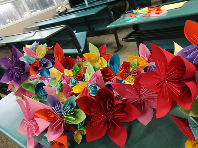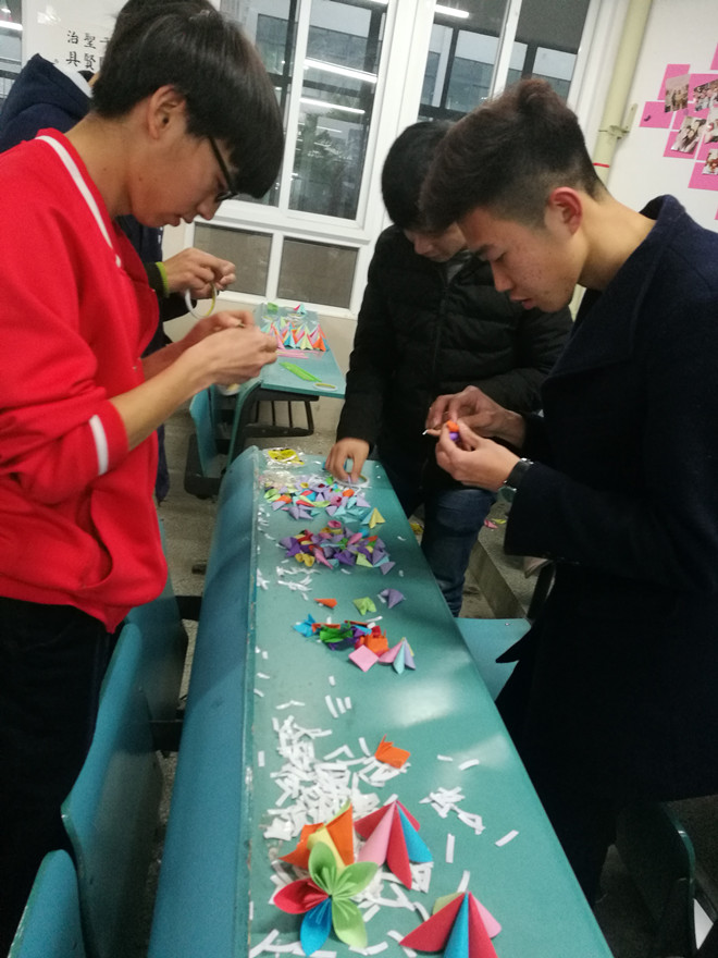 3月7日晚,16博雅中文应用的男生们为汉非的女生们准备了一场特别的女生节活动。他们用彩纸折成了一束束花,送给班里的女生们。据悉,男生们从6日就开始紧张地准备着,从购买彩纸到学习折纸,他们既有担心,也有快乐。终于,这些由男生们亲手折好的花朵在7号下午全部完工,然后便在晚上的祝福活动中将它们送给了女生们。