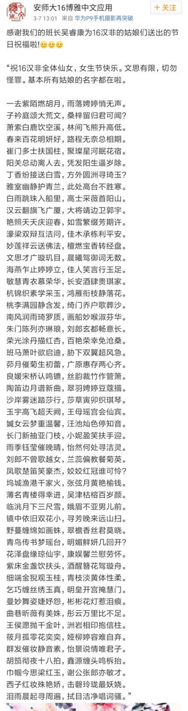 3月7日,16汉语言文学非师范专业一班班长吴睿康为本专业的98位女生准备了一份形式独特的礼物,他将这些女同学的名字串联起来,写进诗中,并命名为《纳名吟》。这让班里的女生很受感动,并直呼:“没错!这就是我们班的班长!”该诗由16博雅中文应用官方QQ和官方微博推送出来,很快就被安师大官微、安师大团委以及头条校园等网络大V转发,可见此诗颇受欢迎。