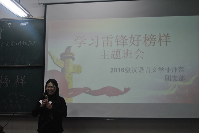 3月2日晚,团支部在本班固定教室举办了以“学习雷锋好榜样”为主题的班会。本次班会由一班团支书刘畅同学主持。