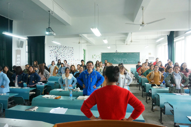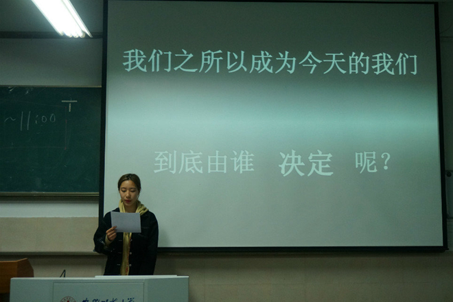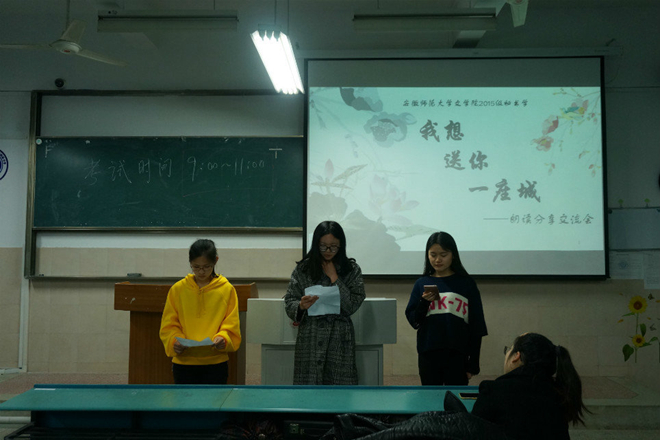 一份书意浮跃字语行间。4月9日晚7时,实习辅导员高燕在2050301教室召开一场“我想送你一座城”的朗读分享交流会。朗读传真情,活动伊始,高燕老师以《朗读者》中斯琴高娃朗读的《写给母亲》为开场白,细腻生动地演绎了对母亲的爱与牵挂,老师的用情至深感染了在场的同学们,一股深厚温暖的氛围逐渐地蔓延。读书畅思想,“世上有两样东西不可直视,一是太阳,二是人心。”程茜同学以东野圭吾的《白夜行》为例,结合PPT进行个人的读书分享交流,她从书中所流露和体会的真情实感打动着每位同学,梁珊、袁莎、李晓蝶合读了杨绛先生的作品《我们仨》,充分展示了书中哀而不伤的笔触与情思。音乐净心灵,最后毕业于音乐学院的高燕老师,向同学们推荐了几首经典悠扬的世界名曲,并用单簧管演奏了歌曲《凉凉》,乐声清透、宛如天籁,令人心旷心怡。