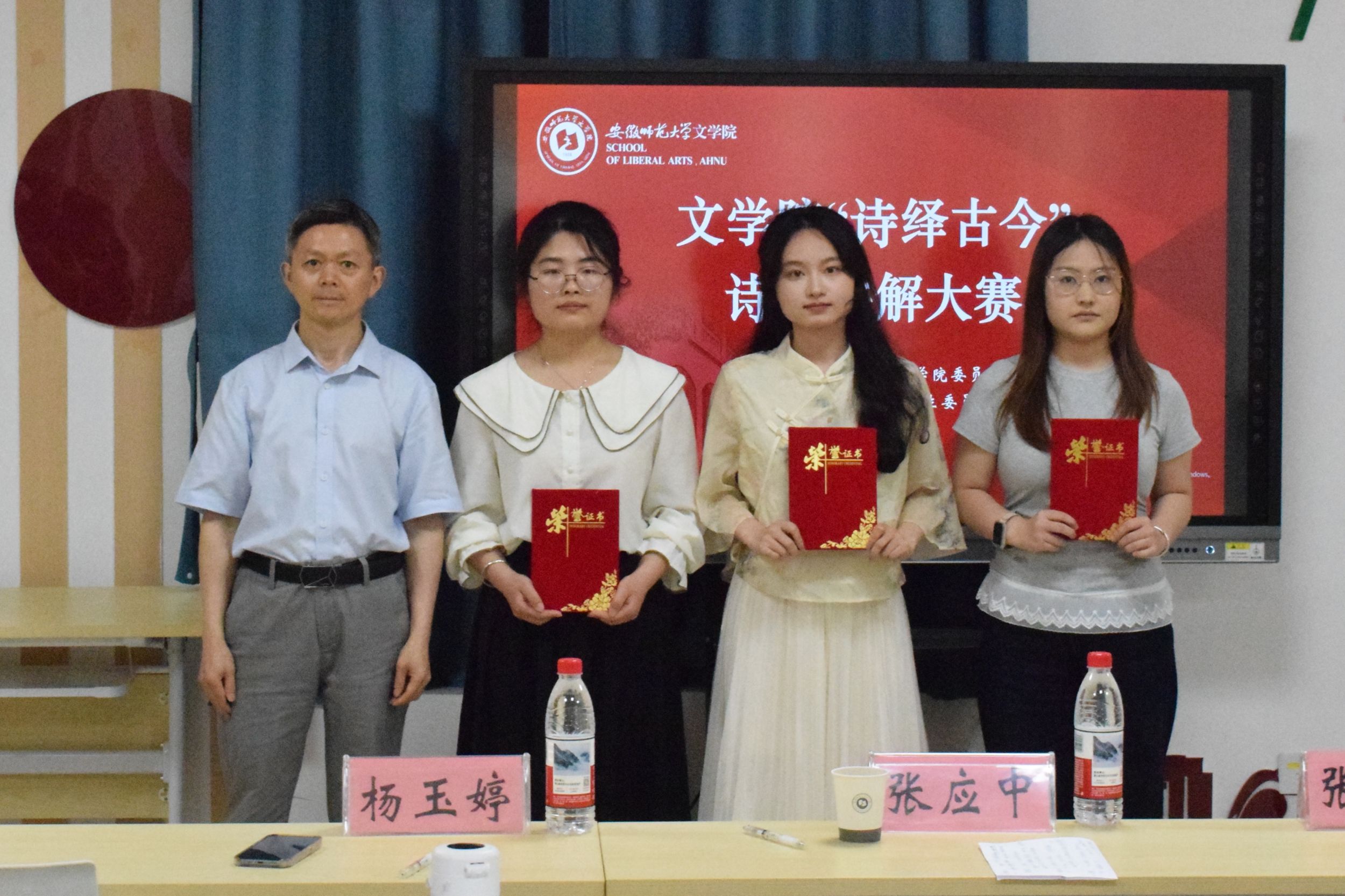 比赛结束后,评委据各位选手的综合表现进行评分、颁奖。其中,三位同学凭借诗词文本的深度解构与出色的临场表现斩获一等奖。张应中、张思桥两位教师点评时,既点赞选手们“于传统文本中凿出新意”的独特视角,亦以“剥茧抽丝”为喻,建议讲解需聚焦一点深挖——如紧扣《相见欢》中某一意象的文学内涵,而非面面俱到;同时提醒,讲解当如同教授学生,避免照本宣科,并在选题时注重诗词内核与时代语境的有机衔接,让古典新意真正落地生根。