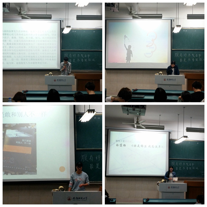 报告会上,同学们用现场演说与精心制作的PPT展示相结合的方式,解读不一样的文学作品,交流阅读心得。张恒同学带来的是曹文轩的《草房子》,介绍了男孩桑桑刻骨铭心,终身难忘的六年小学生活,感人心魄,催人泪下。夏明敏同学分享了经典作品《追风筝的人》,带给同学们巨大震撼的同时,更让大家深刻认识到:犯错并不可怕,可怕的是犯错的人还不去改正它。邱丹丹同学将周宏翔的《我只是敢和别人不一样》娓娓道来,叙述了一个个真实感人的小故事,字字珠玑令同学们回味无穷。冯芷薇同学向大家展示了她最爱的《你是锦瑟,我为流年》,把三毛最真实的一生展现在展现在同学面前。