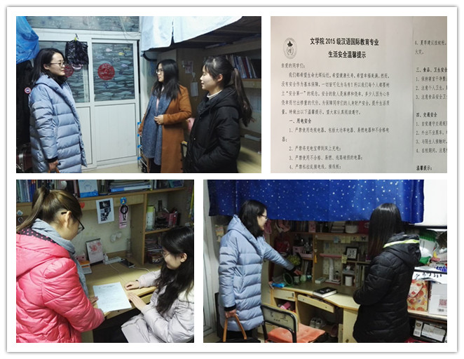 寝室安全问题一直是重中之重,美好的新学期从保障安全开始。2月17日晚,汪旭老师带领生活委员、安全纪律委员等班委对本专业所有寝室进行了安全排查。辅导员逐一走访每个寝室,重点排查了宿舍有无使用违规电器、有无私拉电线、接线板使用是否规范等用电安全问题,每到一处,她针对存在的安全隐患进行详细记录与叮嘱。除此之外,生活委员还向各寝室发放了发放了《必赢线路检测3003no12015级汉语国际教育专业生活安全温馨提示》,要求同学们按照条例规定保障寝室生活舒畅,从制度上为安全保驾护航。