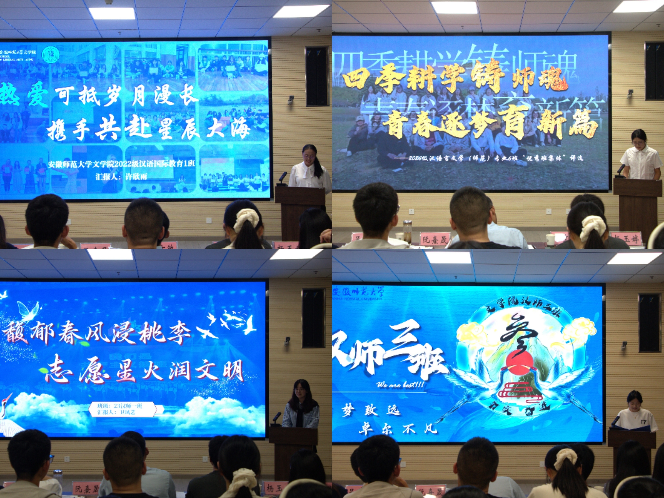 班建融合彰显育人温度。各班级注重将专业特色融入集体建设,如2024级汉语言文学4班以“文、论、史、艺、教”为主线推进班级整体发展;2023级汉语言文学(师范)2班以“知不足而奋进,望远山而力行”为精神指引,强化思想引领与学风塑造;2023级汉语言文学(非师范)1班则立足校训,展现班级在学业、志愿与思想建设方面的协同推进。