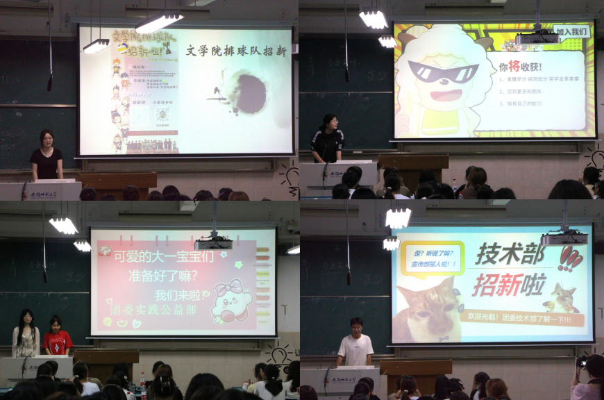 创意宣讲,点燃新生热情。9月23日晚宣讲会采用四会场并行模式,确保高效有序。各部门负责人精心筹备,PPT设计上,各部门大胆创新,动态元素与趣味插图交相辉映。学习部以“爆料体”模拟采访,生动有趣;团委综合部则采用“综艺风”排版,搭配表情包与弹幕文案,瞬间拉近与新生的距离。宣讲中,部长们化身学长学姐,真诚分享个人成长经历,从初入组织的懵懂到如今的独当一面,每一个蜕变故事都激发着新生的共鸣。互动提问、口号呼应等环节,更是将宣讲会变成了双向交流的盛宴。部长们语言风趣、情绪饱满,将部门文化、工作价值与青春态度完美融合,让新生在轻松愉快的氛围中感受到学生组织的魅力。各招新PPT中嵌入的招新群二维码成为焦点,新生们纷纷扫码,期待早日成为这个大家庭的一员。