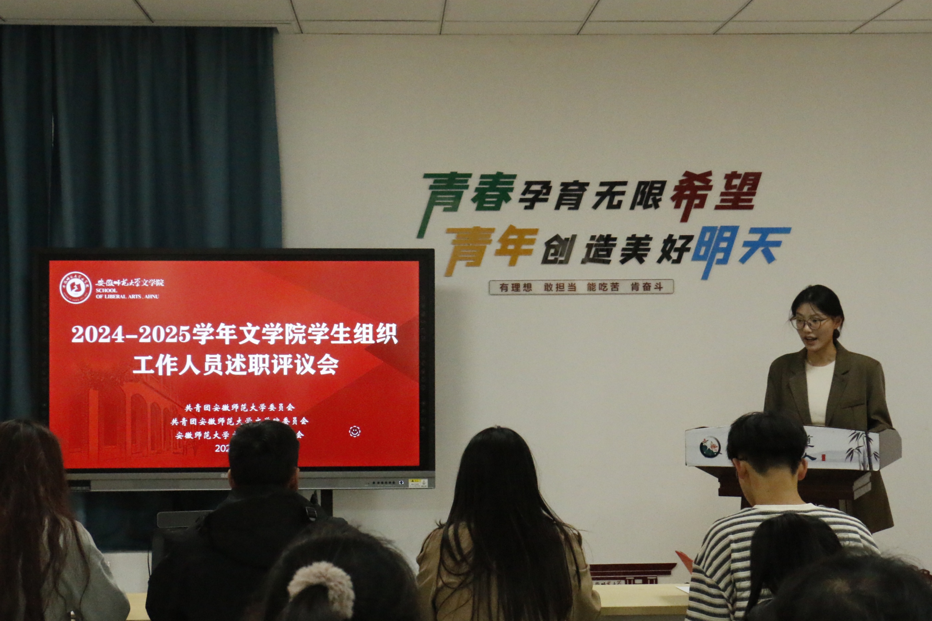 会议伊始,汤丽娜介绍了本次述职评议会的主题意义与参会人员构成。随后,来自学生会综合部、文艺体育部、主席团以及团委组织委员、宣传委员、各部门负责人的24位述职人员依次上台,围绕学年履职情况进行汇报。