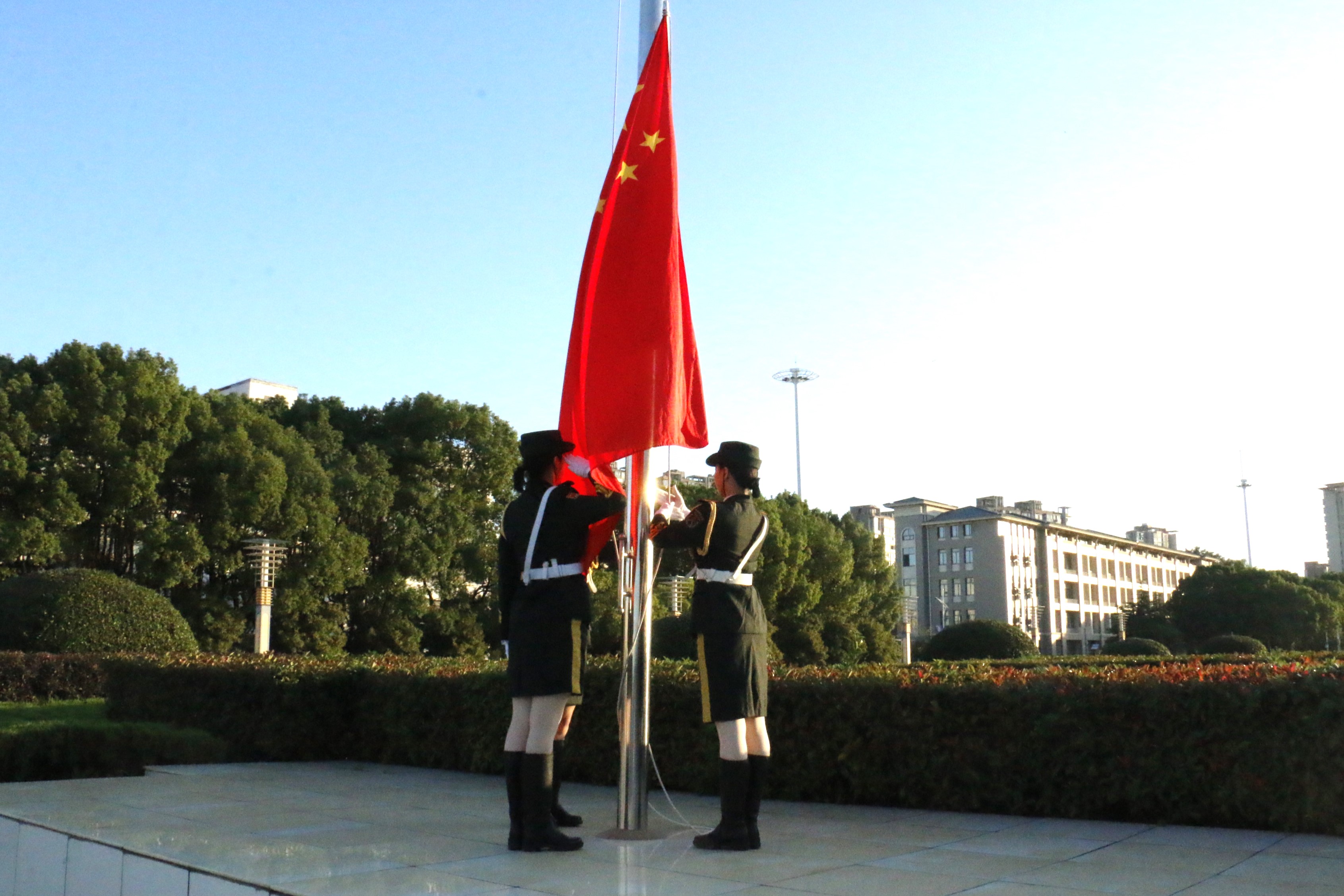仪式在庄严的氛围中拉开帷幕。英姿飒爽的国旗护卫队迈着铿锵有力的步伐,护卫着五星红旗走向升旗台。伴随着雄壮的《义勇军进行曲》,全体师生面向国旗行注目礼,高唱国歌,注视着鲜艳的五星红旗迎着朝阳冉冉升起,共同表达对伟大祖国的无限热爱和崇高敬意。