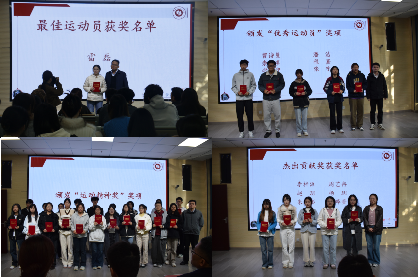 在表彰环节,与会嘉宾依次为获奖集体与个人颁奖。左方敏为雷磊颁发“最佳运动员”称号,阮熹晟为曹诗曼等六人颁发“优秀运动员”称号,冯文君为胡继昊、张迦勒、时筱等同学颁发“运动精神奖”,范栩桐为李梓源等六人颁发“团体与贡献奖”。运动员代表雷磊结合长跑经历,分享体育对心态与成长的磨砺,强调“在人生赛道中跑得更稳、更远,找到自己的节奏”。
