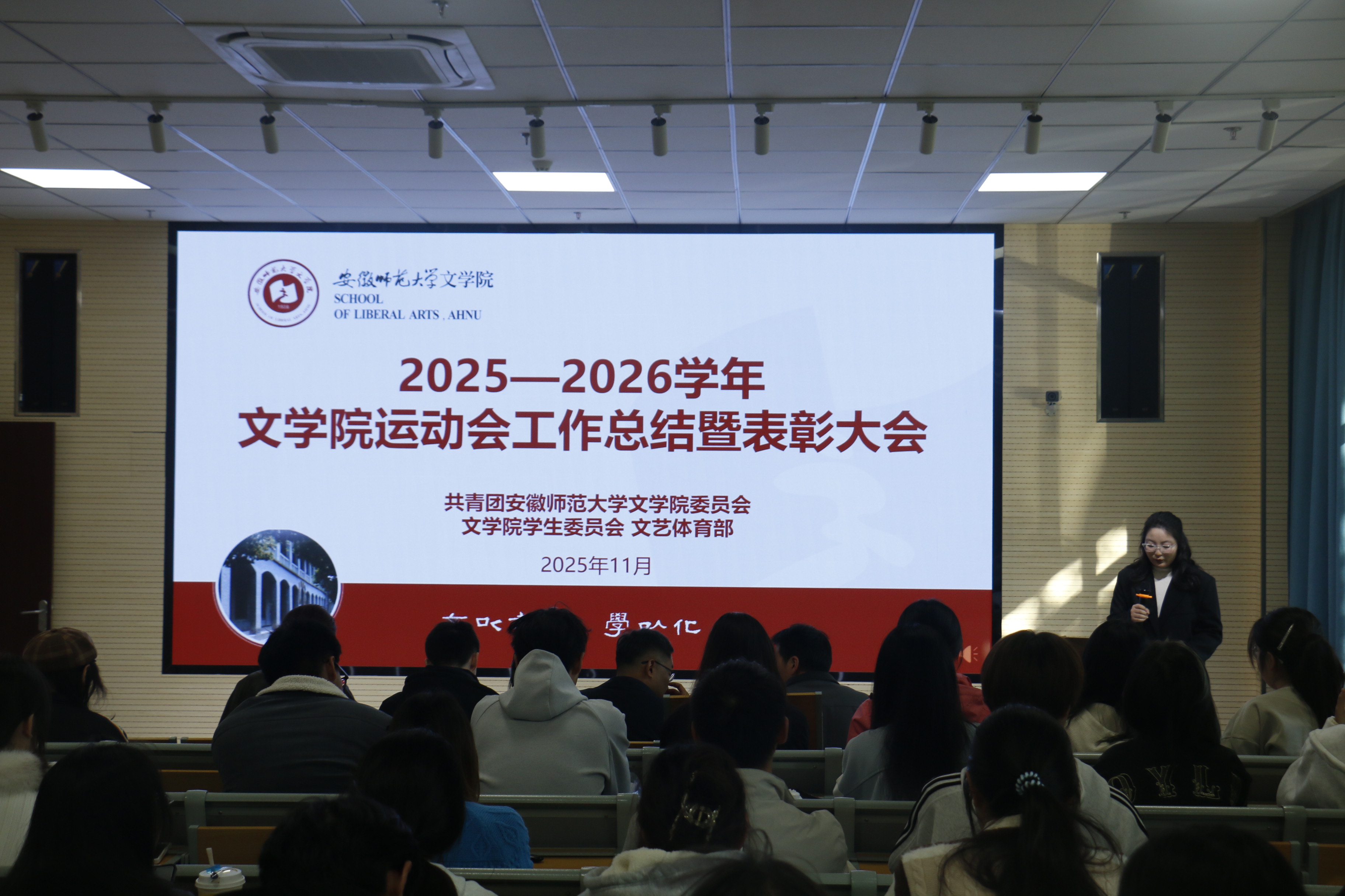 11月12日下午,必赢线路检测3003no1在文典楼F108报告厅举行2025—2026学年运动会工作总结暨表彰大会。学院党委副书记左方敏、团委书记阮熹晟、团委副书记冯文君、2023级辅导员范栩桐,以及团委与学生会成员、全体运动员、啦啦队和方阵代表参加会议。